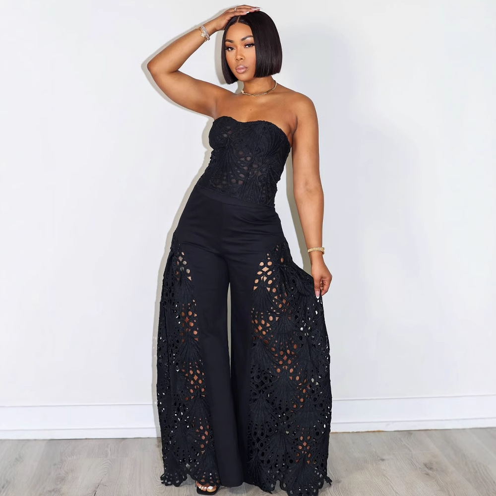 Elegant women’s two-piece suit featuring lace tube top, combining European and American fashion styles for a chic look.