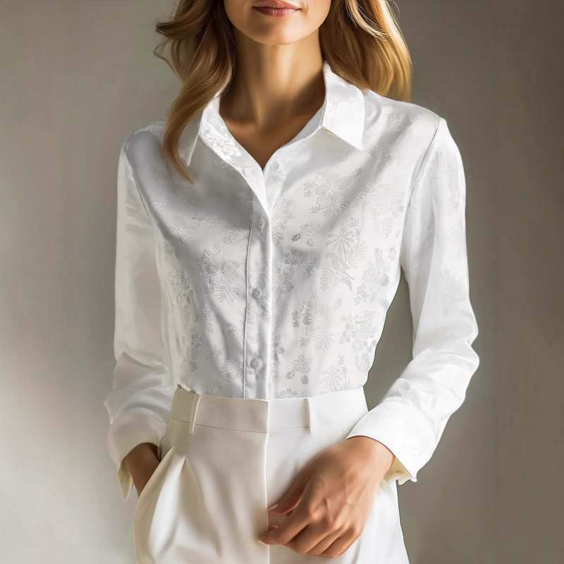 Elegant women’s long sleeve shirt featuring French jacquard fabric with a refined subtle pattern and stylish lapel design.