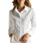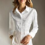 This women’s long sleeve shirt is crafted from premium French jacquard fabric, showcasing a delicate and subtle pattern that adds sophistication to any wardrobe. Designed with a classic lapel collar, the shirt offers a refined silhouette suitable for both professional and casual occasions. Its high-quality material ensures comfort and durability, while the understated design provides versatile styling options. Ideal for enhancing everyday elegance while maintaining a polished appearance.