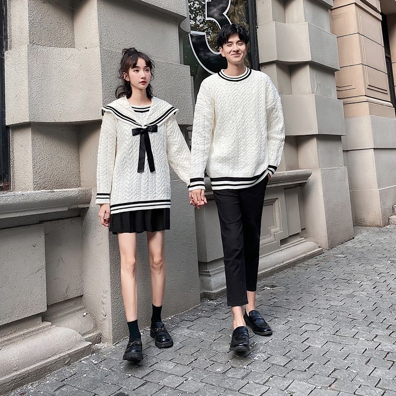 Stylish white Japanese-style thick fairy sweater with color-blocked design and round neckline for comfortable warmth.