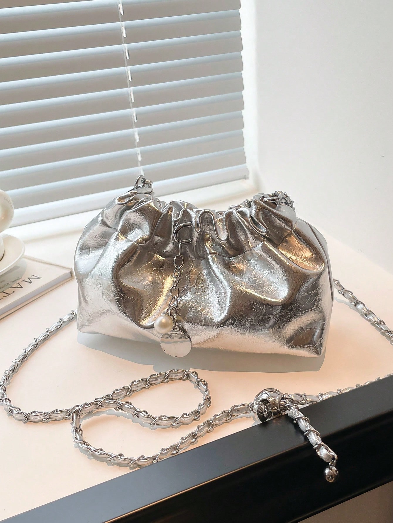 Fashionable pleated cloud bucket bag with chain strap, versatile for single shoulder use, perfect for modern women.