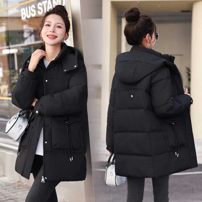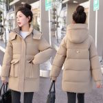 Stylish and warm women’s winter cotton coat in Korean design, featuring thick insulation and mid-length coverage for cold weather.