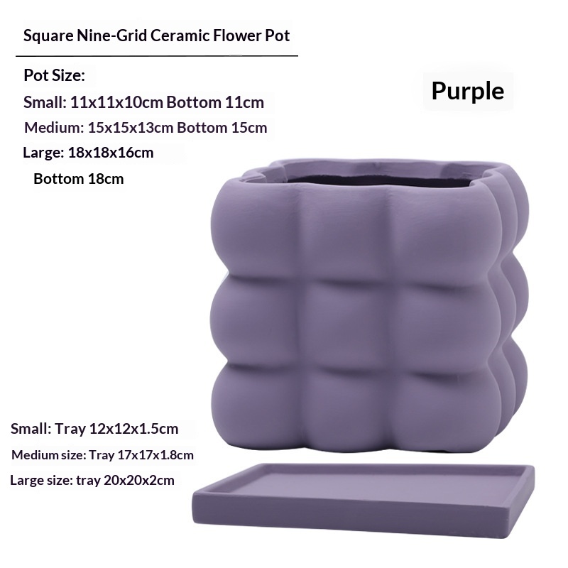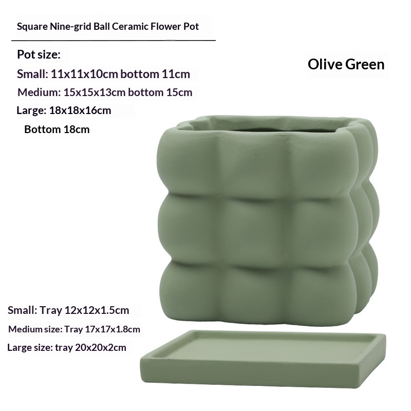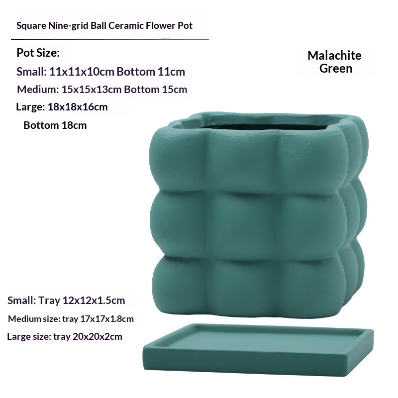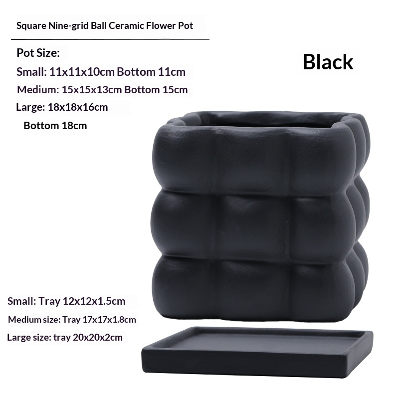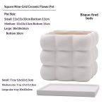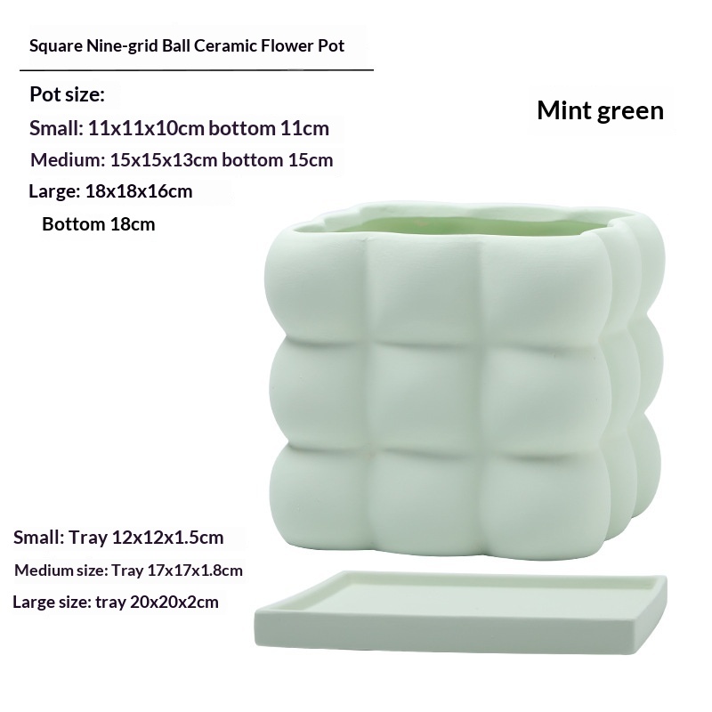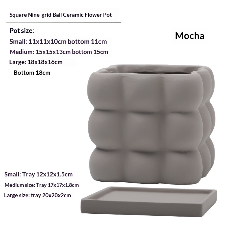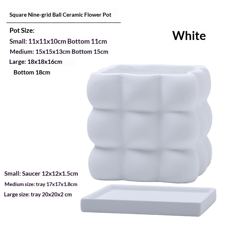 This ceramic flower pot features a nine-grid ball-shaped square design, combining aesthetic appeal with functionality. Crafted from high-quality ceramic, it ensures durability and a refined finish. Each compartment is equipped with drainage holes to prevent waterlogging and maintain optimal soil moisture. The included saucer collects excess water, protecting surfaces and promoting healthier plant growth. Ideal for indoor use, this flower pot facilitates organized planting of multiple small plants or succulents, making it suitable for home or office décor.