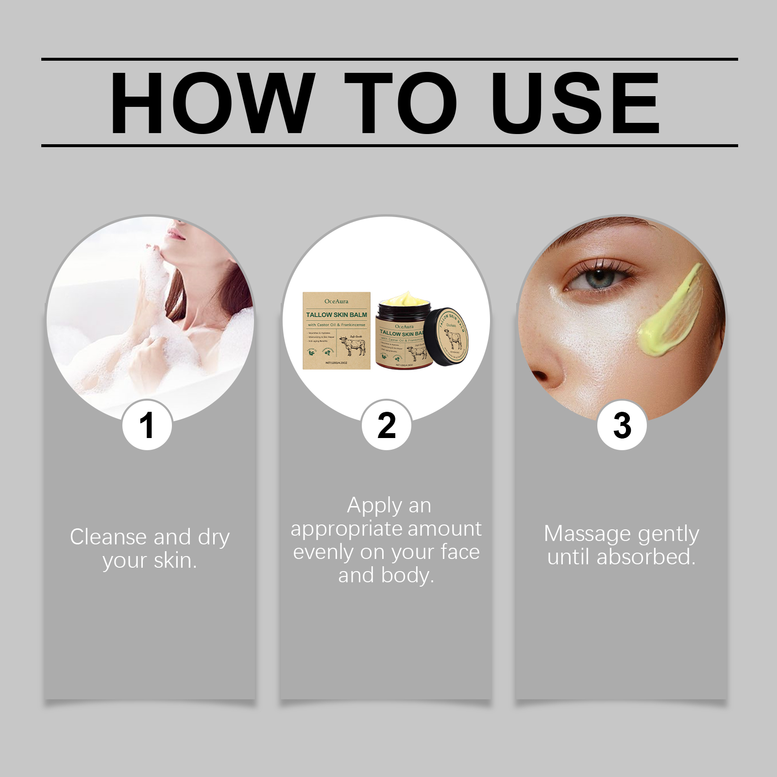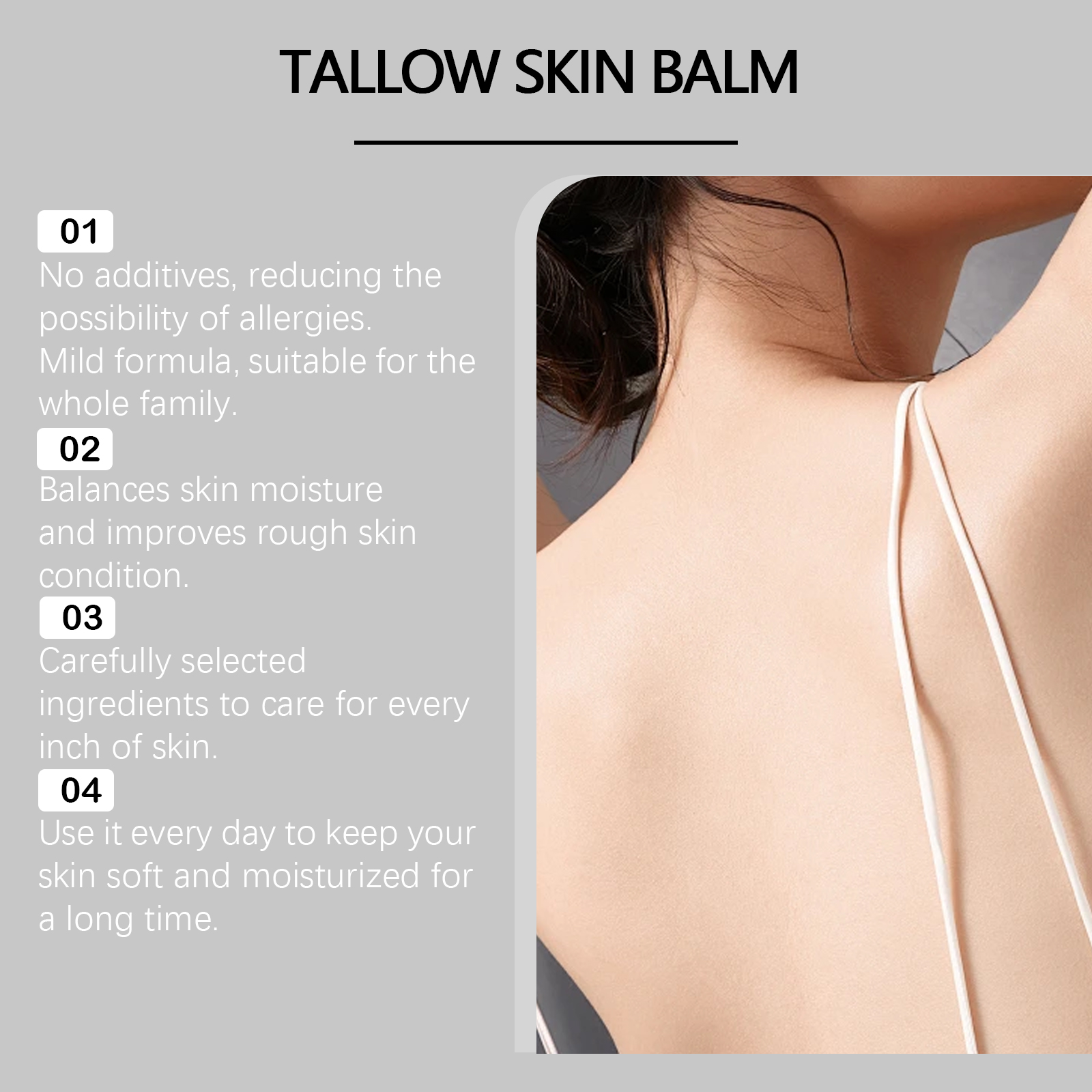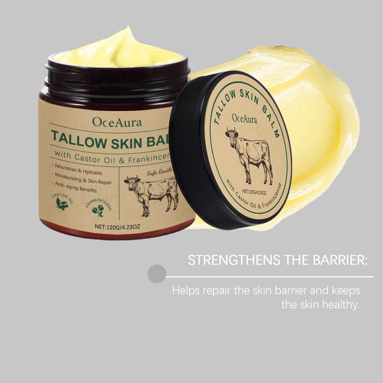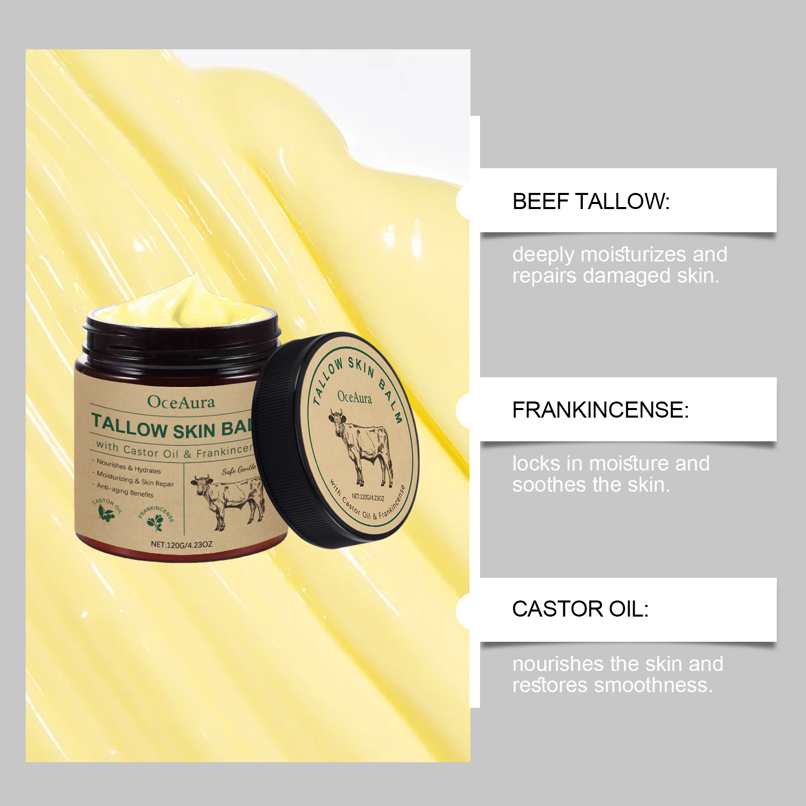 Our beef tallow moisturizing cream is carefully formulated with glycerin, mineral oil and glycerin stearate. Designed specifically for rapid skin penetration and immediate improvement of dryness. The usage method is extremely convenient: Clean and dry the skin. Take an appropriate amount and apply it evenly to the face and body. Gently massage until absorbed. And it can provide long-lasting moisture for dry skin and relieve discomfort. Specially designed for sensitive skin, it reduces irritation and offers gentle care.