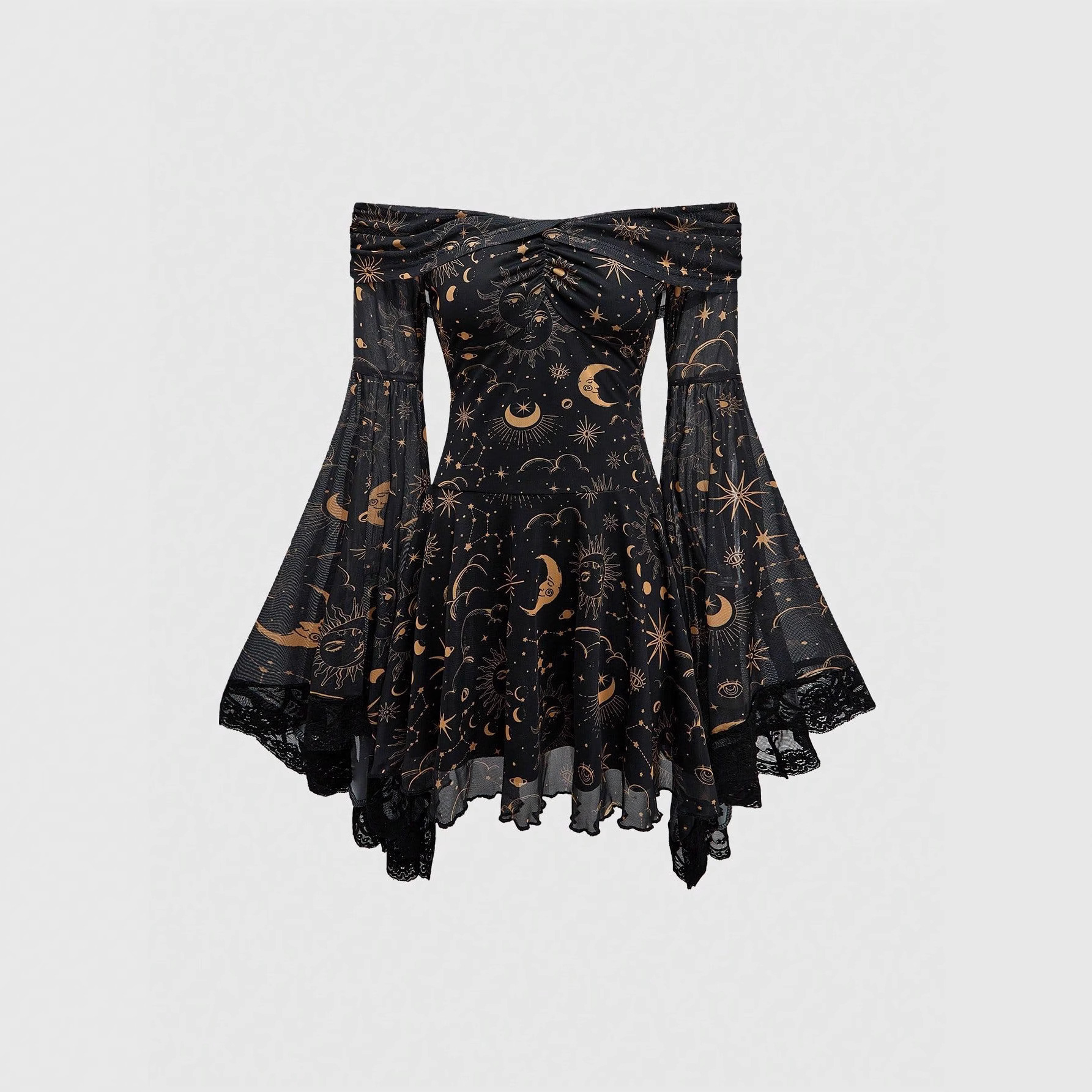 Elegant off-shoulder A-line dress featuring flared sleeves and breathable mesh fabric for a stylish and comfortable fit.