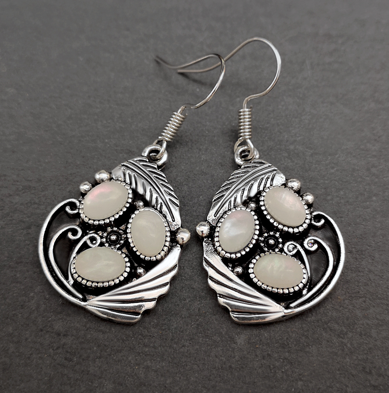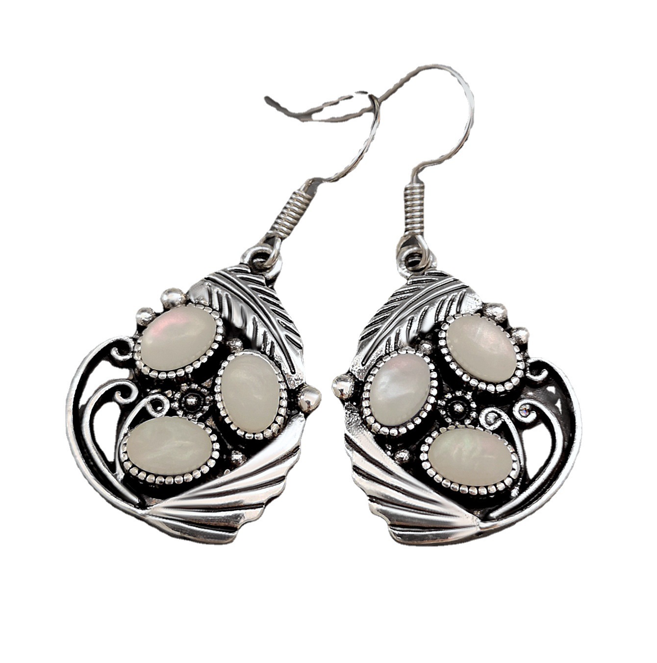 Elegant opal moonstone earrings featuring leaf, feather, and shell motifs for a unique, nature-inspired accessory.
