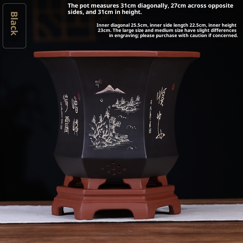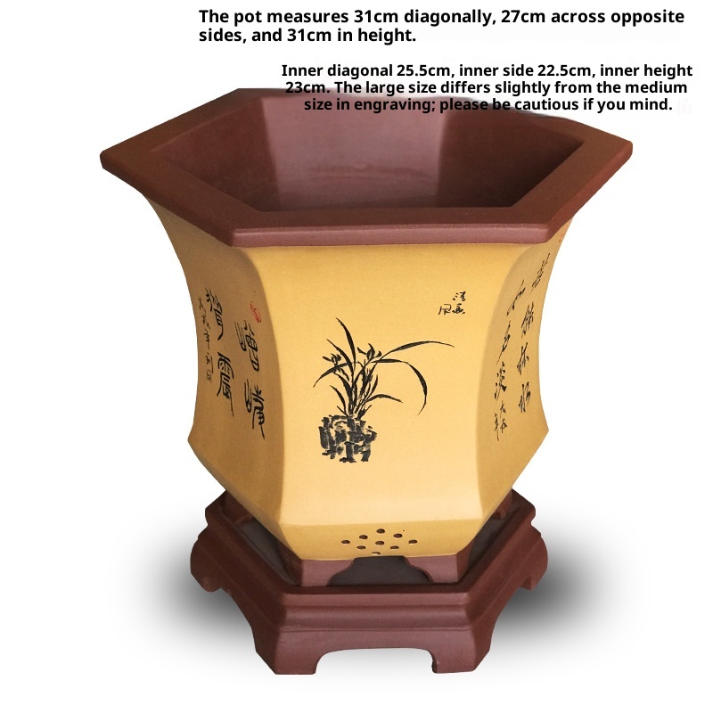This Orchid Hexagonal Yixing Purple Sand Flower Pot is crafted from genuine Yixing clay, renowned for its porous texture that promotes healthy root aeration and moisture retention. The pot features a uniquely hexagonal shape, enhancing its aesthetic appeal while providing stability for delicate orchid plants. Its natural purple sand composition ensures durability and breathability, creating an optimal environment for plant growth. The artisan design combines traditional techniques with practical function, making it ideal for bonsai cultivation and ornamental horticulture. The pot’s size and form perfectly accommodate orchid roots, supporting their development and enhancing display elegance.