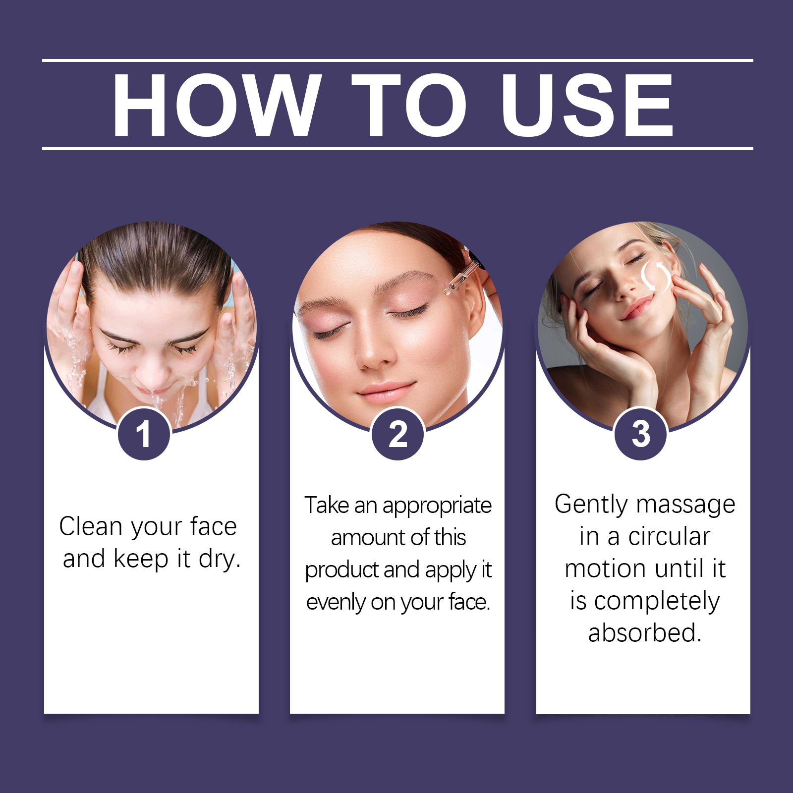Our facial serum contains hyaluronic acid and psoralen phenol. It moisturizes the face. Its application method is very simple: clean your face dry, keep the appropriate amount of this product evenly applied to the face, gently massage in a circular motion until completely absorbed. And can effectively smooth fine lines and wrinkles, leaving skin with a youthful glow.