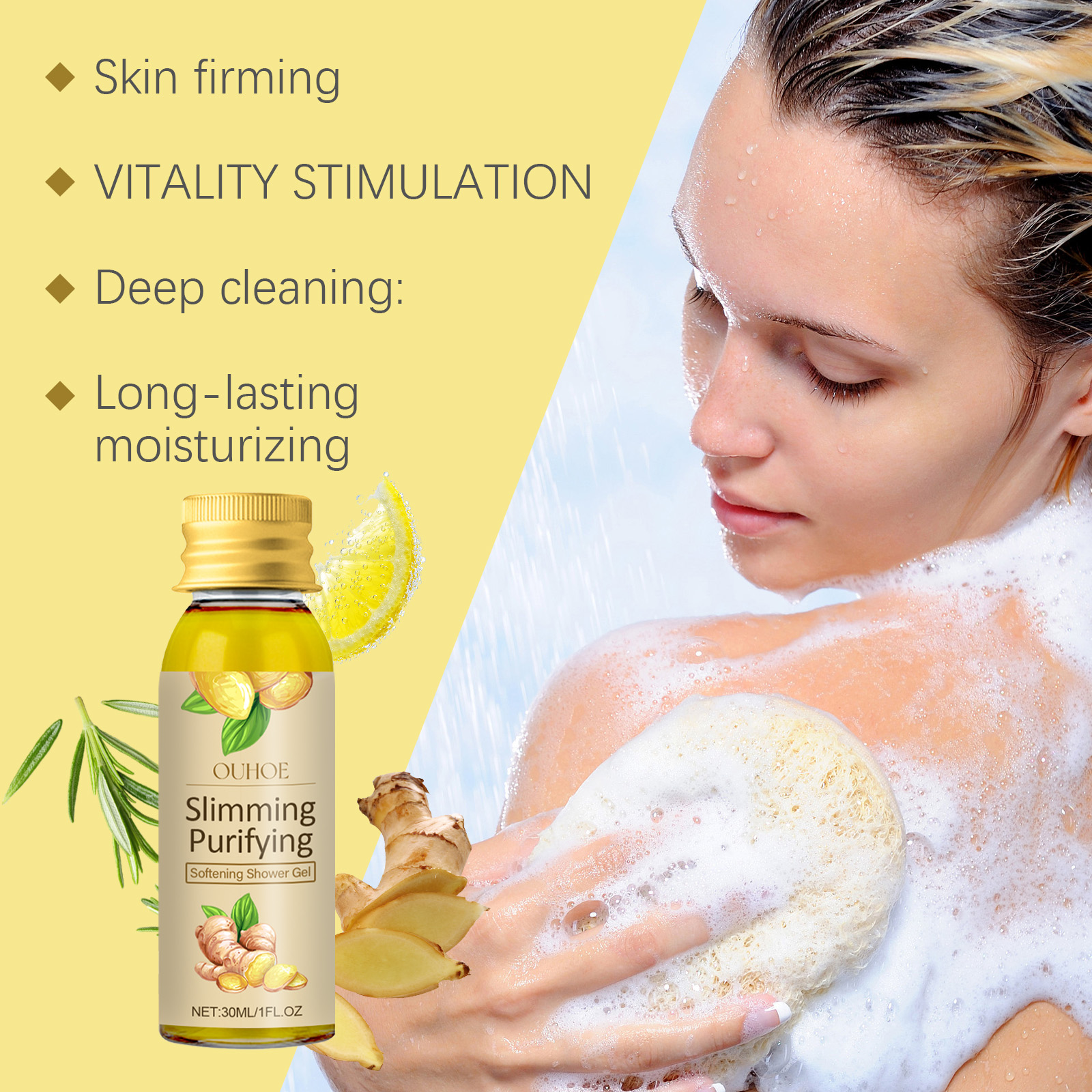 Our ginger body wash contains ginger root extract, lemon fruit extract. It continues to work with moisturizing ingredients, leaving skin soft and improved throughout the day, leaving skin smoother after use. Its application method is very simple: moisten the skin, take an appropriate amount of this product in the palm, gently massage into the foam, apply the foam to the skin, massage the body in a circular motion, and then rinse off with water. It also keeps the skin hydrated and moisturized for a long time.