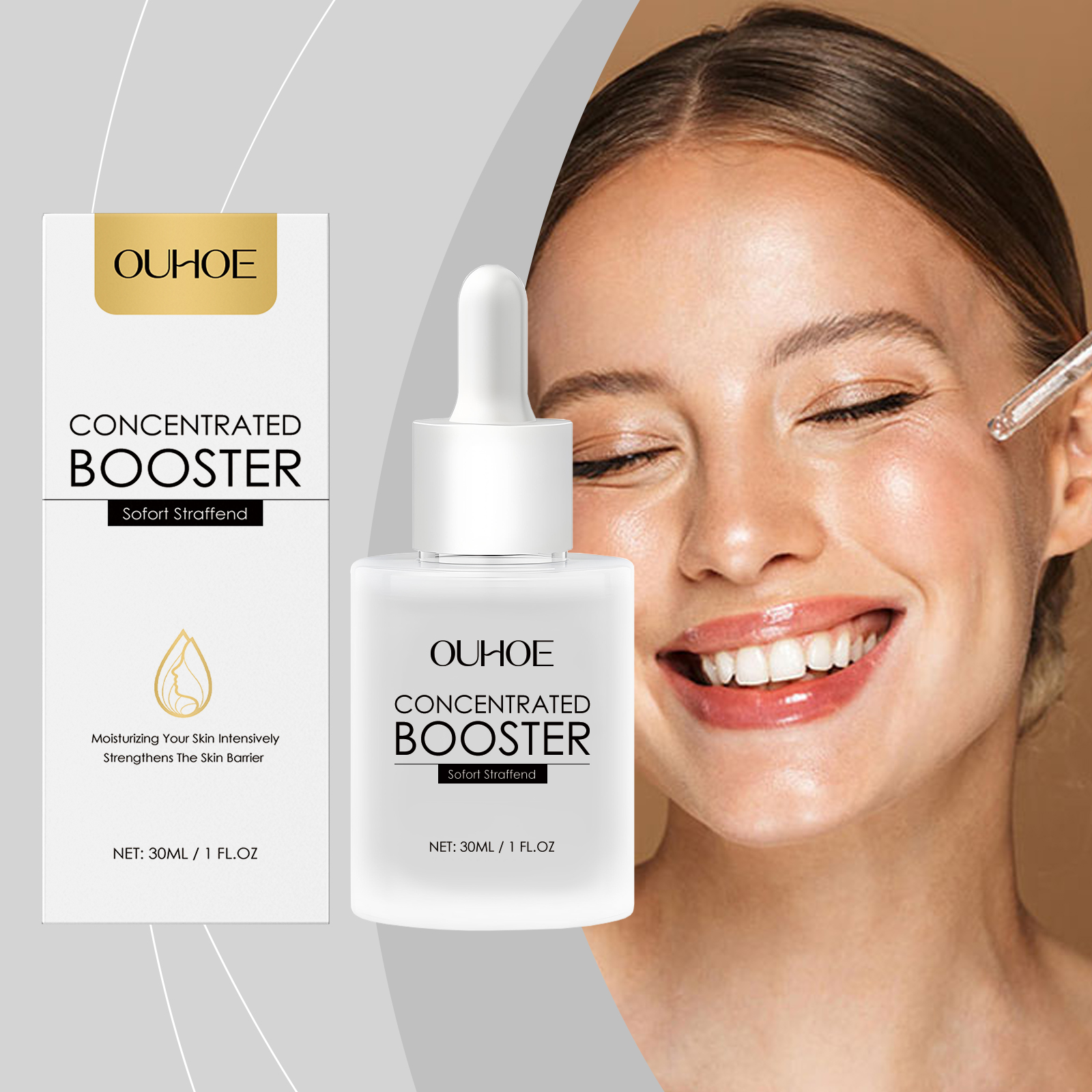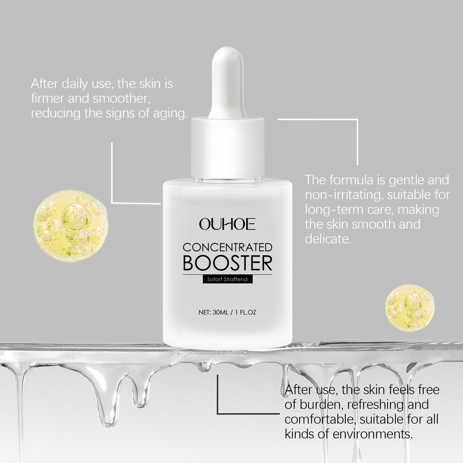 OUHOE Hyaluronic Acid Essence smooths fine lines, firms skin, and brightens the face with a soft, delicate formula.