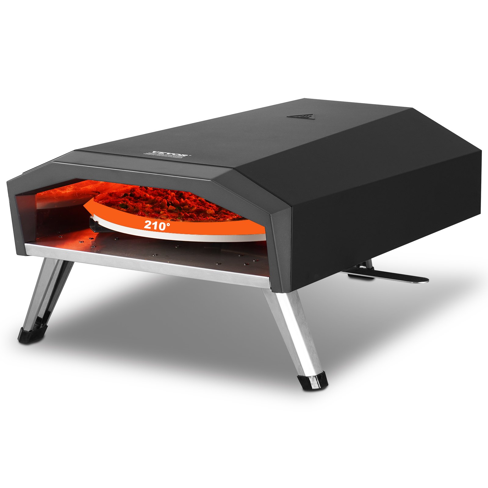 Compact 13″ gas-fired pizza oven with cordierite stone, foldable legs, and waterproof cover for camping and backyard use.