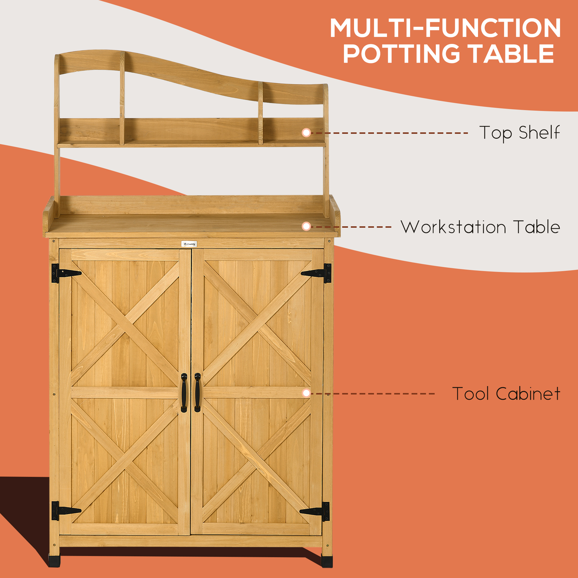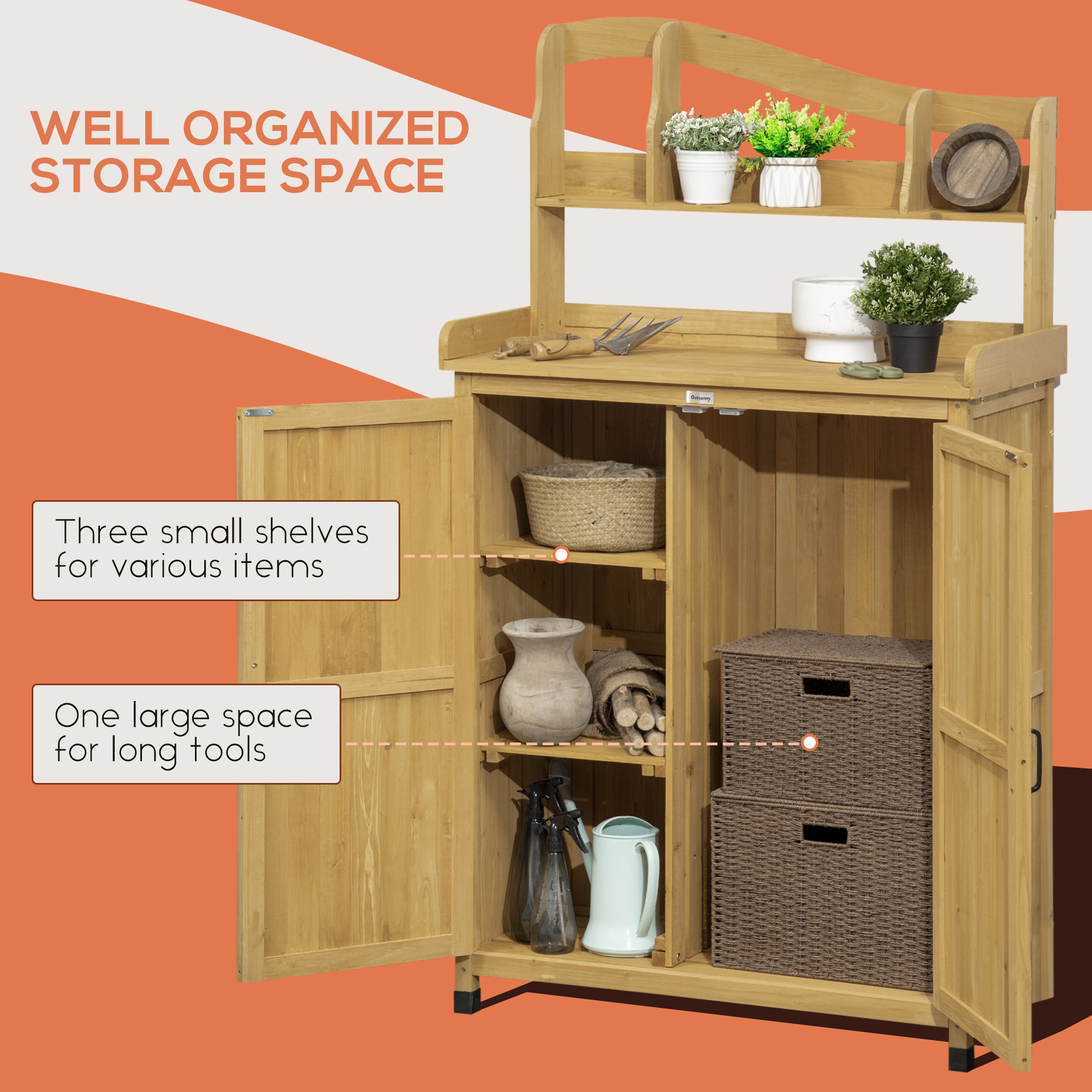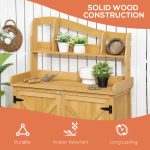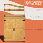 This outdoor storage cabinet and potting table is designed to provide a practical solution for garden organization and plant care. Featuring a robust construction, it offers ample storage space for gardening tools and supplies, while the attached table surface is ideal for potting and plant preparation. Its weather-resistant materials ensure durability and longevity in various outdoor conditions. The compact design facilitates easy placement in garden areas, enhancing functionality without occupying excessive space. Suitable for both amateur and professional gardeners, this versatile unit promotes efficient workspace management and convenience during gardening tasks.