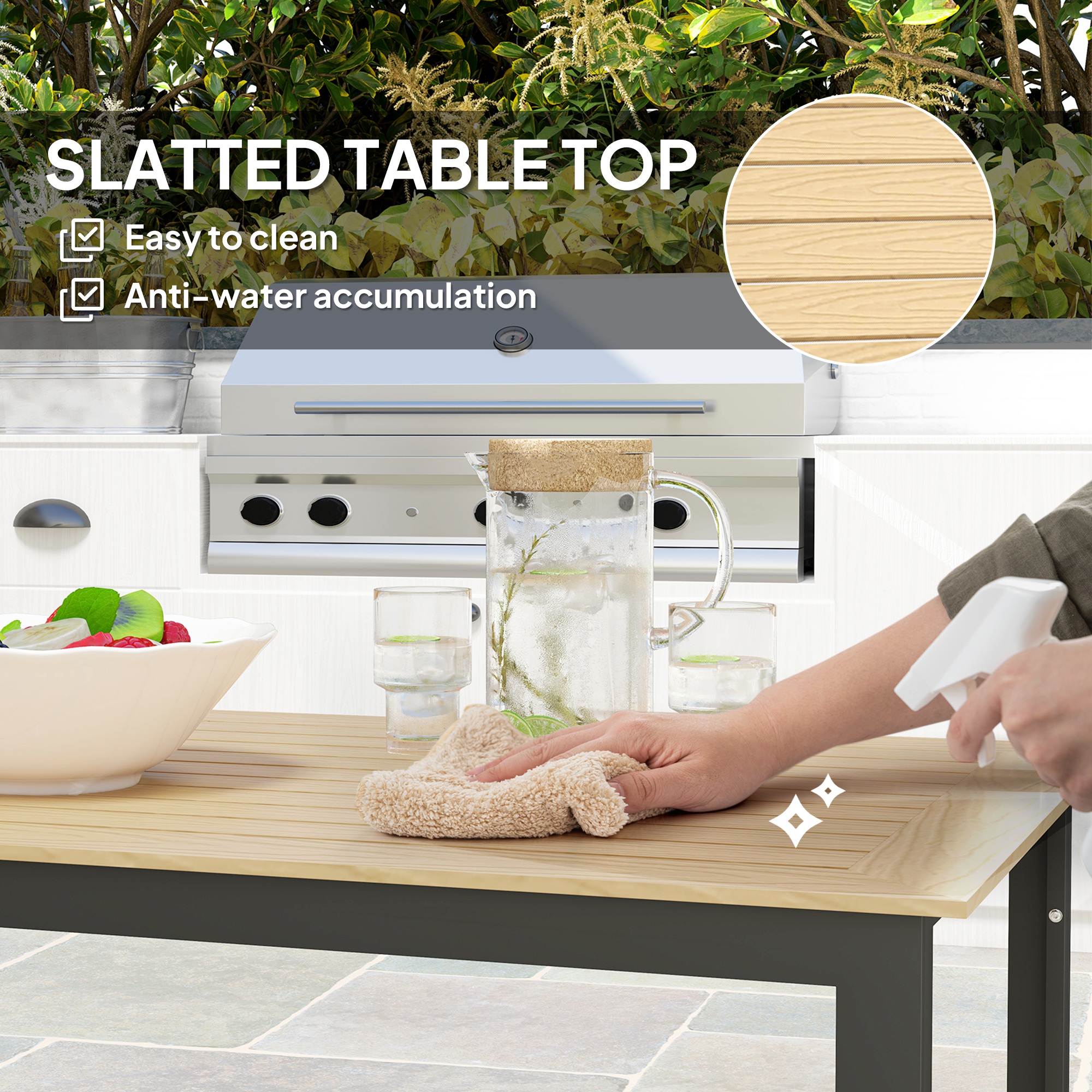 The Outsunny garden table is designed to comfortably accommodate six people, measuring 175 cm in length, 78 cm in width, and 75 cm in height. Featuring a durable metal frame and a slatted tabletop, this outdoor dining table is ideal for balconies, decks, or patios. Its sturdy construction ensures long-lasting use and weather resistance, while the slatted surface allows for quick water drainage. The rectangular shape offers ample space for meals and gatherings, making it a practical and stylish addition to any outdoor setting.