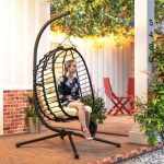 - Reliable construction: The swing chair features a rust-resistant steel frame with “X” shape support at the bottom for stability. Crafted with PE rattan and a rope-weaving back, it resists fading under sun and rain, offering weather-resistant durability.