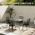 Durable Outsunny steel frame outdoor garden table with slat top, seating 4. Dimensions 80x80x74 cm in sleek grey finish.