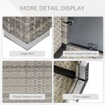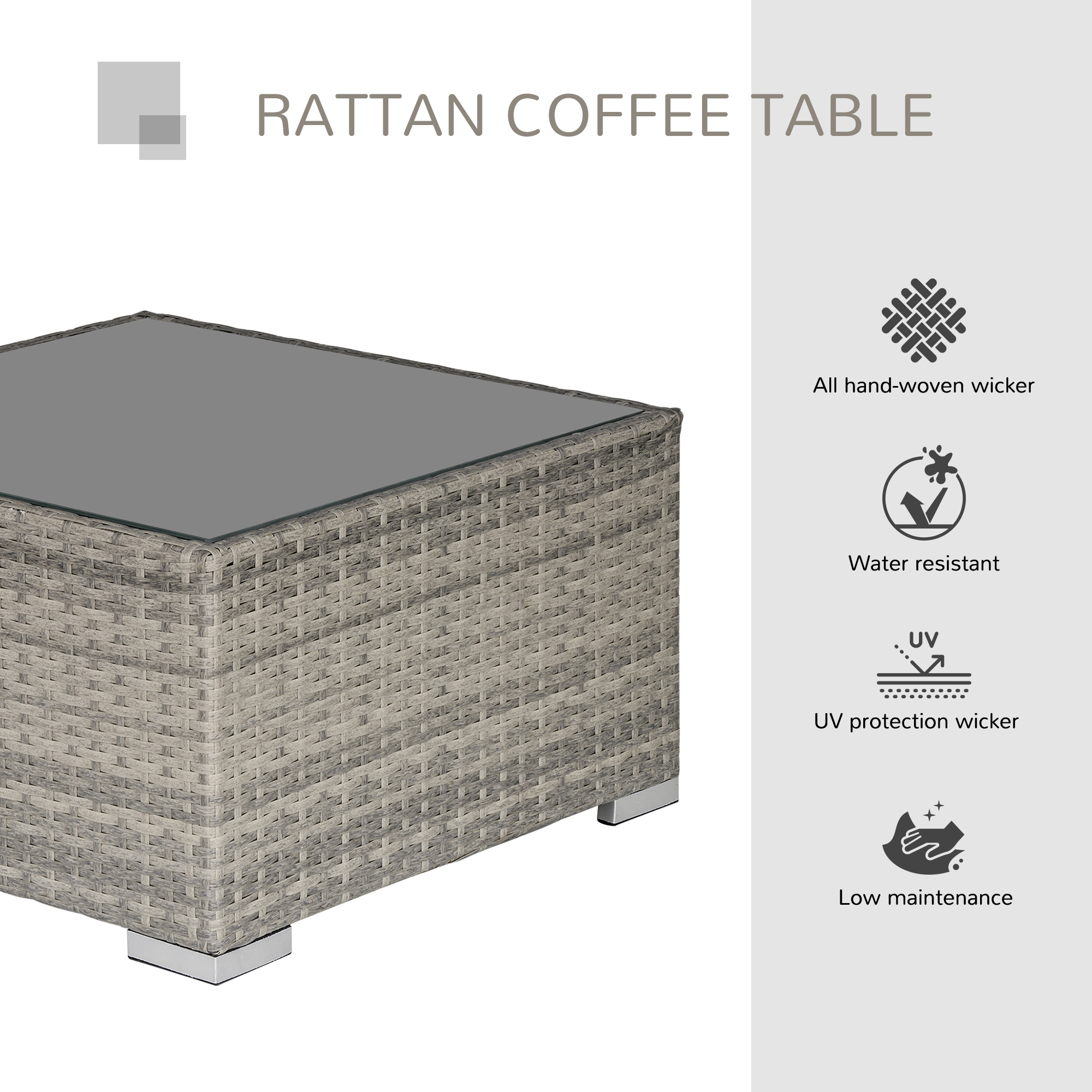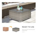 The Outsunny Square Table features a robust PE wicker rattan construction, designed for outdoor use with a stylish light grey finish. The tabletop is made of tempered glass, providing a smooth, easy-to-clean surface. Its square design offers a practical and elegant addition to any patio or garden setting, combining durability with aesthetic appeal. The weather-resistant materials ensure long-lasting performance, while the neutral light grey color complements various outdoor decors.