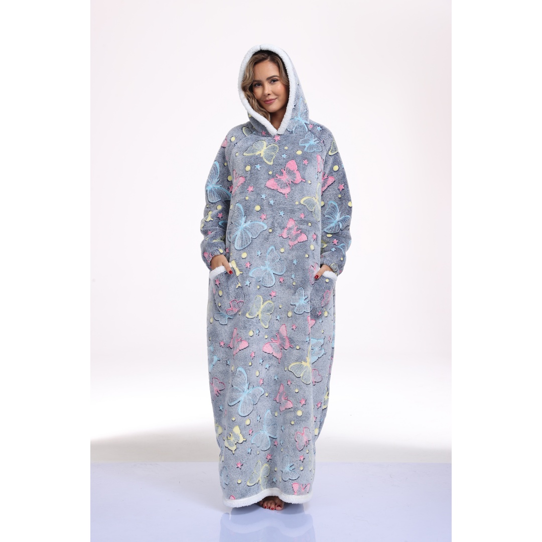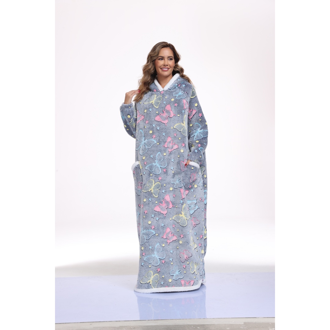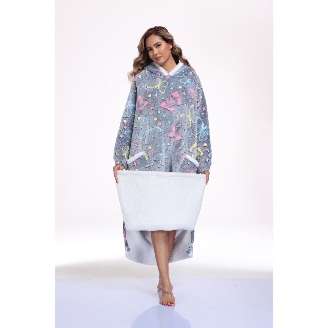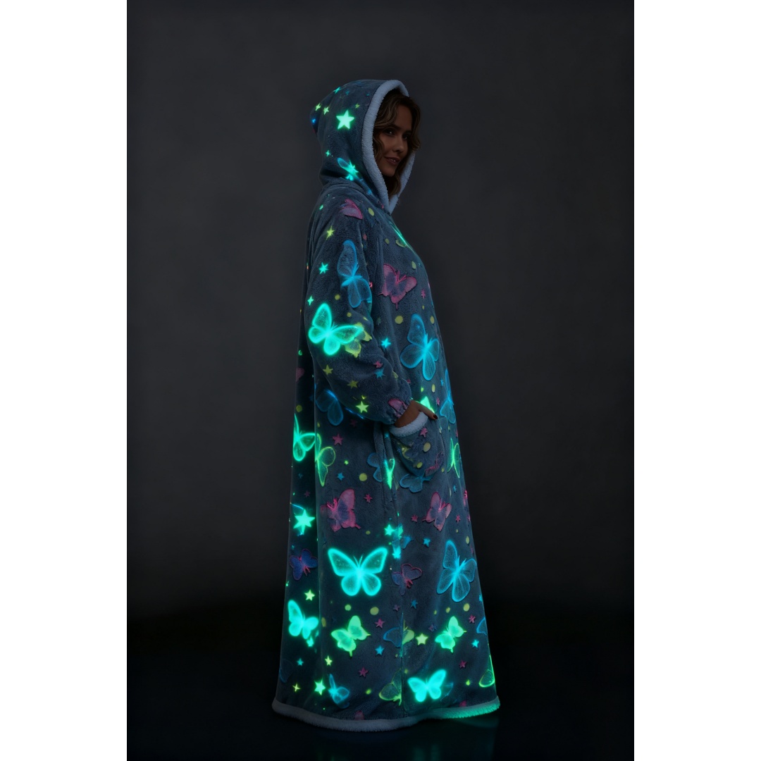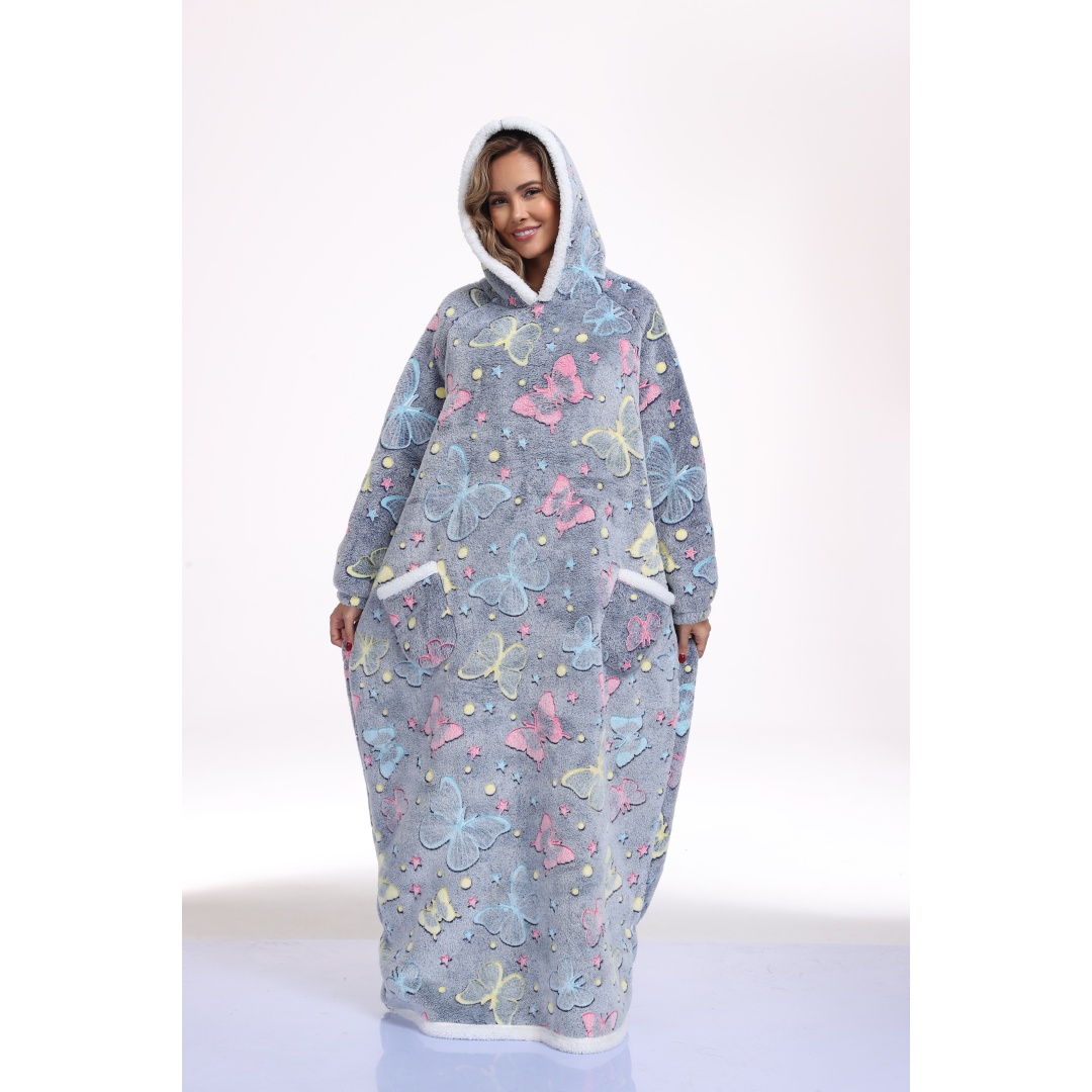 This oversized wearable hooded blanket combines the comfort of a sherpa-lined sweatshirt with the convenience of a blanket. Measuring 59 inches in length, it offers ample coverage and warmth. The fabric incorporates glow-in-the-dark printed designs that enhance visibility and style in low-light settings. Designed specifically for women, this long, cozy sweatshirt is ideal for lounging indoors or staying warm during colder days. The soft sherpa lining ensures maximum comfort, while the hood provides additional coverage and warmth. Its loose, oversized fit makes it effortless to wear and move around in, blending the functionality of a blanket with casual apparel.