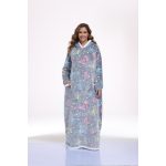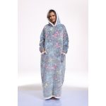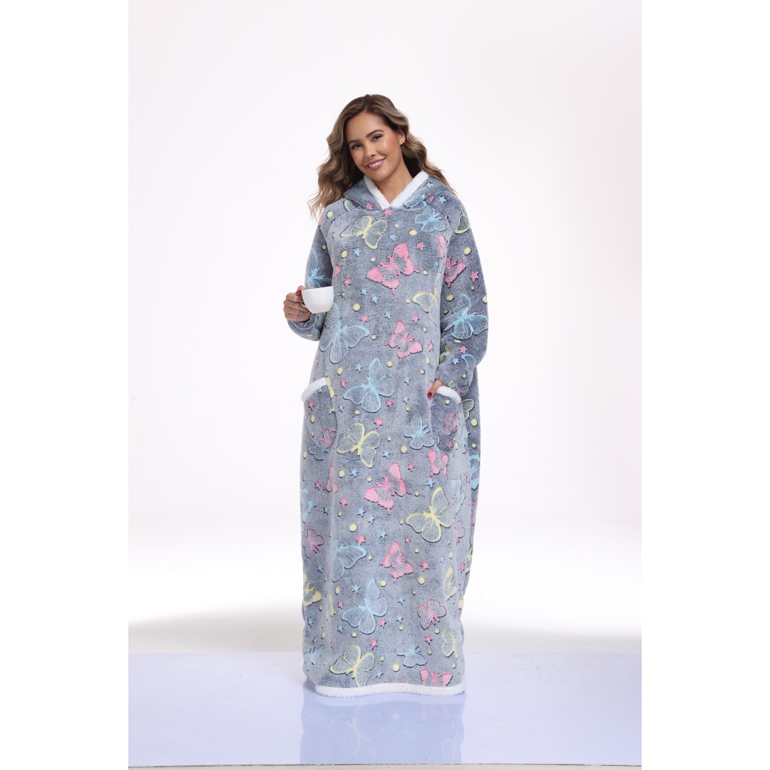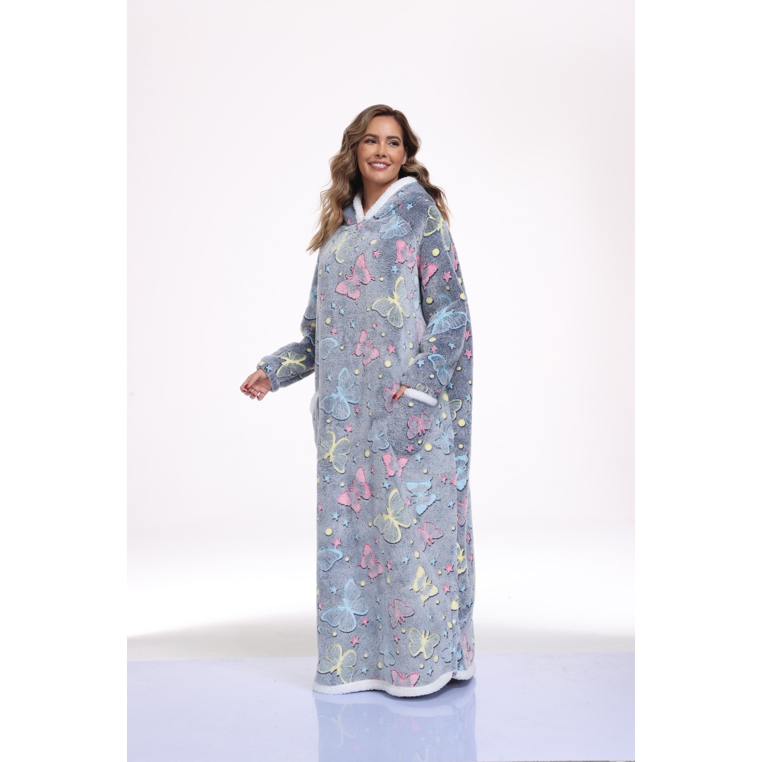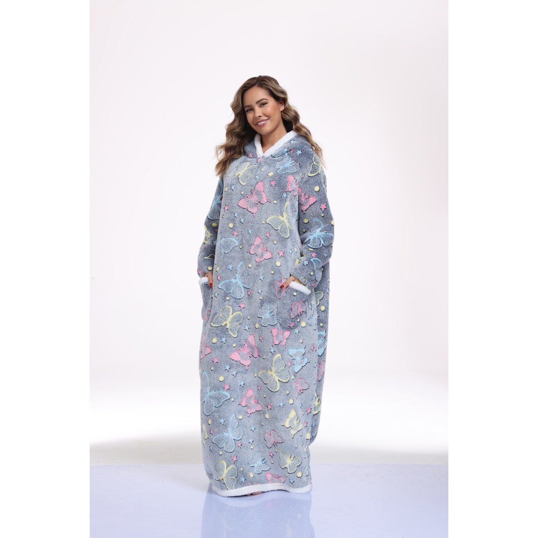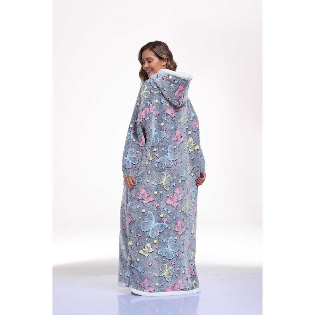 This oversized wearable hooded blanket combines the comfort of a sherpa-lined sweatshirt with the convenience of a blanket. Measuring 59 inches in length, it offers ample coverage and warmth. The fabric incorporates glow-in-the-dark printed designs that enhance visibility and style in low-light settings. Designed specifically for women, this long, cozy sweatshirt is ideal for lounging indoors or staying warm during colder days. The soft sherpa lining ensures maximum comfort, while the hood provides additional coverage and warmth. Its loose, oversized fit makes it effortless to wear and move around in, blending the functionality of a blanket with casual apparel.