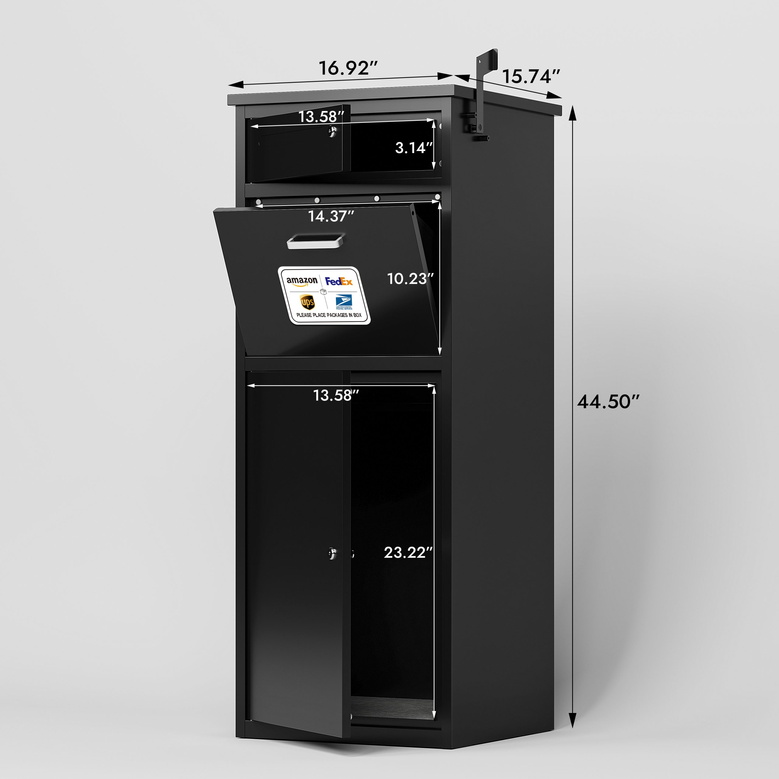 Constructed from heavy-duty steel, this outdoor package delivery box measures 15.74 inches in length, 16.92 inches in width, and 44.5 inches in height. It features a robust lock system designed to prevent theft, ensuring secure storage of delivered parcels. Its weather-resistant finish protects against environmental elements, making it suitable for porch installation at residential or office locations. The spacious interior accommodates a variety of package sizes, combining durability with secure convenience for reliable mail and package deliveries.