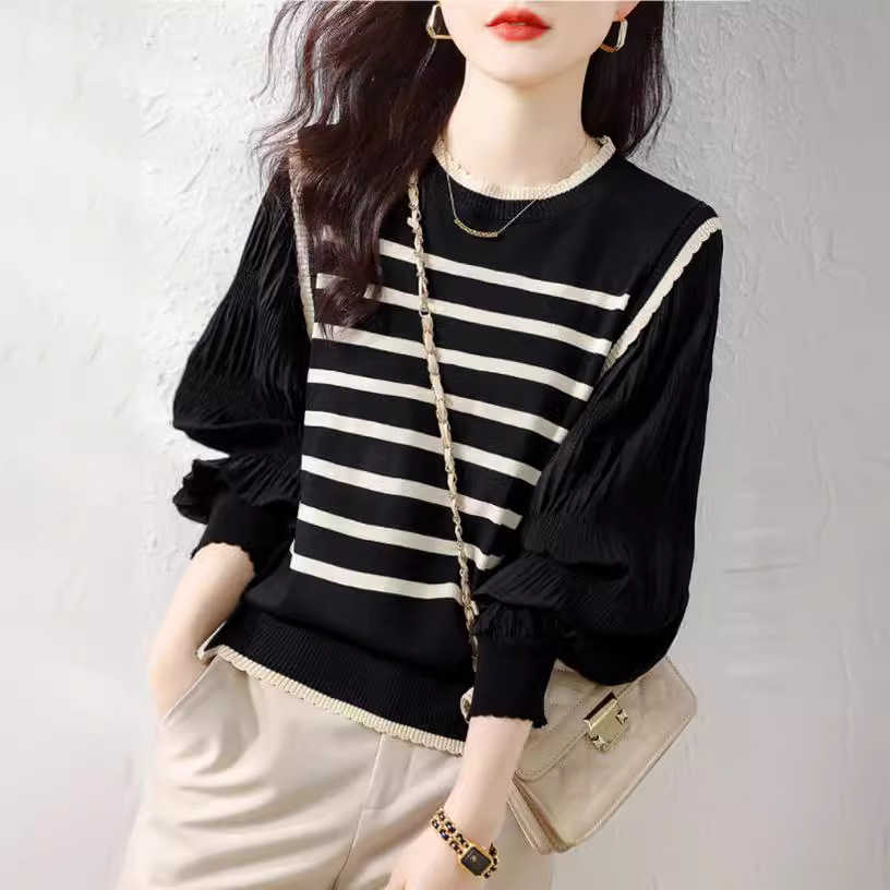 This knitted top combines style and comfort with its unique patchwork lace collar and striped design. The lantern sleeves add a tasteful volume, enhancing the silhouette while providing a trendy aesthetic. Crafted from soft, breathable fabric, this top is ideal for versatile wear throughout the seasons. Its refined details and striped pattern make it an excellent choice for both casual and semi-formal occasions.