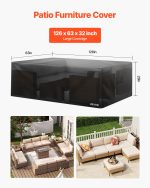 This premium patio furniture cover is crafted from 420D heavy-duty polyester, offering robust waterproof protection for outdoor dining tables and chairs. Its large rectangular shape, measuring 126 inches in length, 63 inches in width, and 28 inches in height, accommodates a wide range of patio sets. Designed with integrated air vents, the cover prevents moisture buildup and reduces wind uplift, ensuring reliable all-weather durability. The black finish provides a sleek and versatile look suitable for any outdoor setting, effectively shielding furniture from rain, dust, UV rays, and other environmental elements throughout the year.