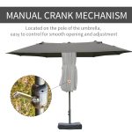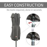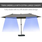 This 15-foot rectangular patio umbrella features a double-sided canopy design that offers extensive shade coverage for outdoor settings. Constructed with weather-resistant materials, the umbrella provides reliable protection against sun exposure. Its robust base ensures stability and secure placement on various surfaces. Perfectly suited for outdoor markets, patios, and gardens, this umbrella combines functionality with elegant design to enhance any outdoor space.