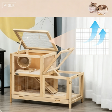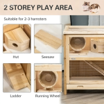 Multi-level wooden hamster cage featuring a seesaw and removable tray, ideal for small animals and comfortable habitat setup.