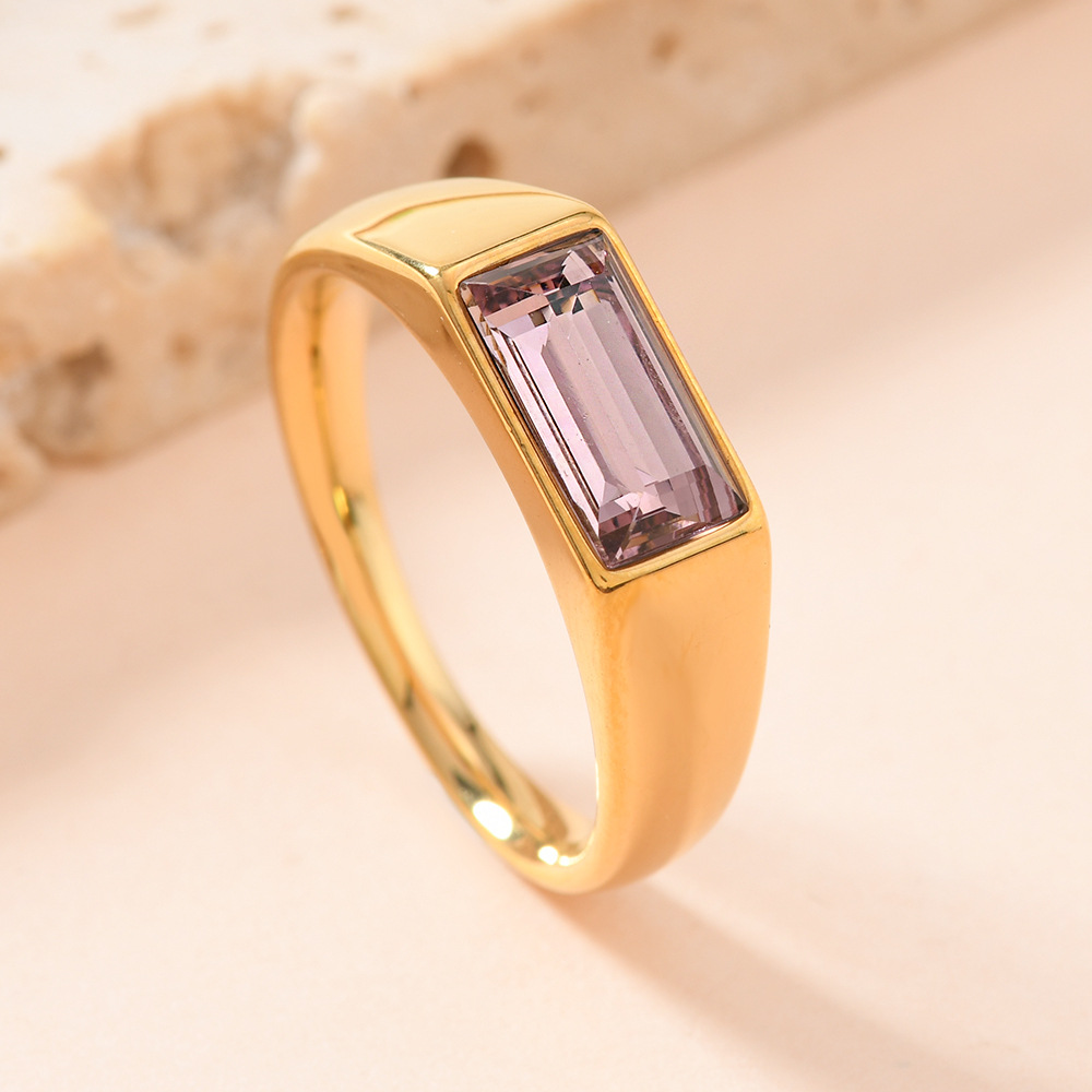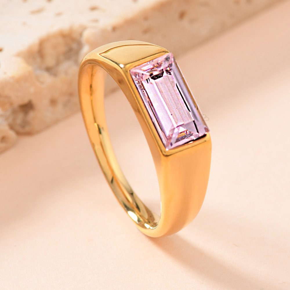 Elegant 18K gold plated rectangular finger ring adorned with colorful rhinestones for a distinctive and stylish look.