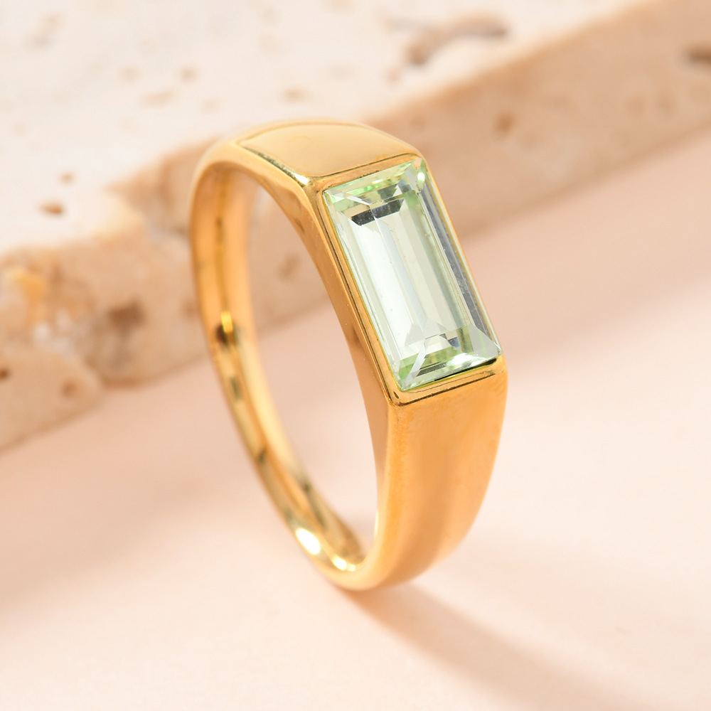 This finger ring features a rectangular design embellished with vibrant rhinestones, creating a unique and eye-catching accessory. Crafted with an 18K gold plating, the ring offers excellent durability and a luxurious finish. Its personality-driven design complements various styles, making it suitable for daily wear or special occasions. The precision casting ensures a seamless and comfortable fit, highlighting the refined craftsmanship of the piece.