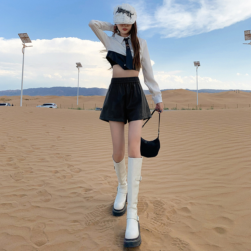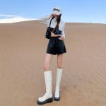 These petite women’s shorts feature a high waist and an A-line silhouette, crafted from soft, stretchable leather for enhanced comfort. Designed for summer wear, they combine style and functionality, providing a flattering fit that accentuates the waist while allowing ease of movement. The premium leather material ensures durability and a sophisticated appearance suitable for various casual and semi-formal occasions.
