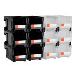 Set of 12 plastic stackable storage bins, ideal for organizing garage, office supplies, small parts, and accessories in black and transparent design.