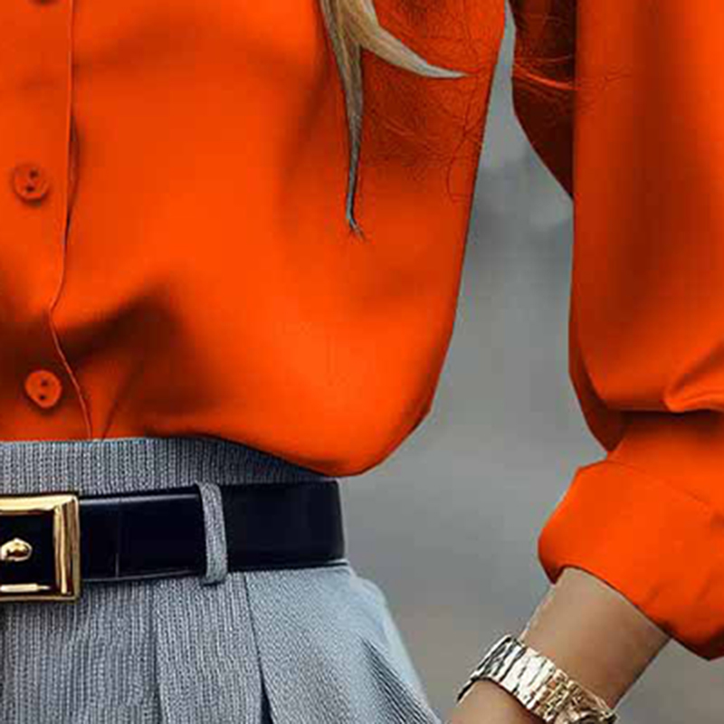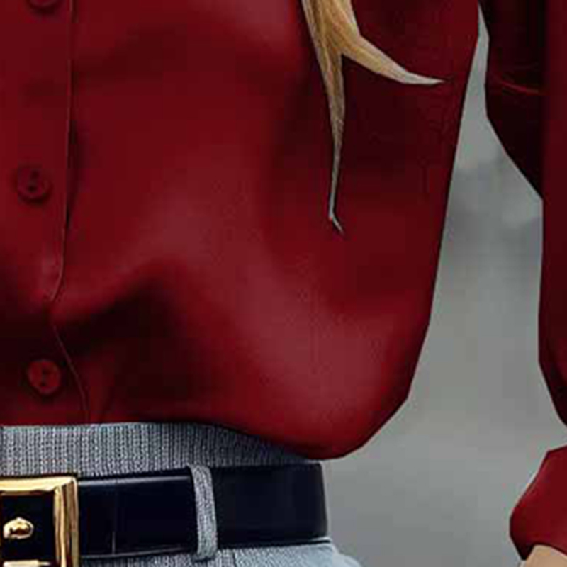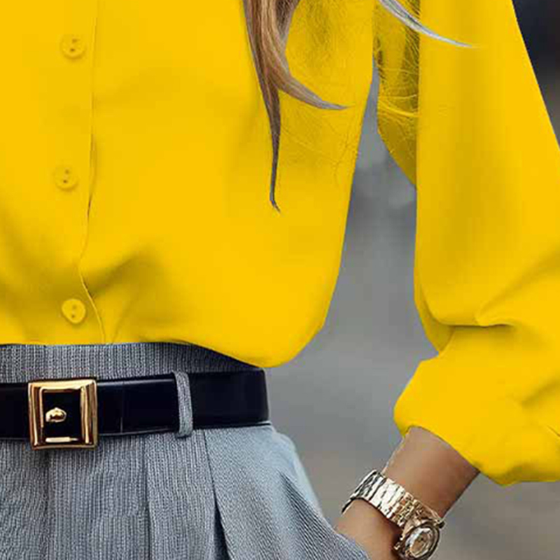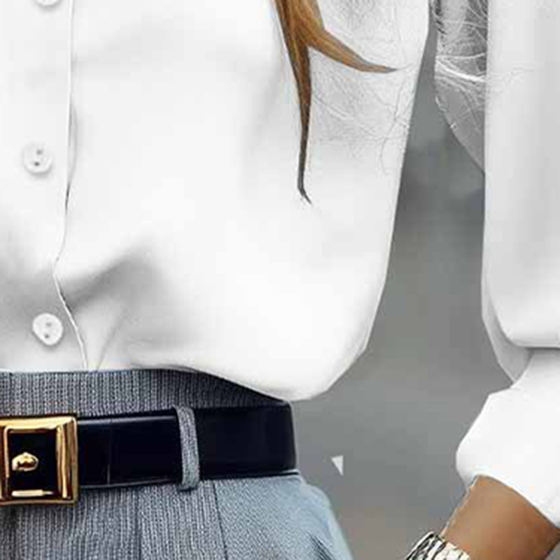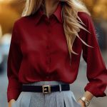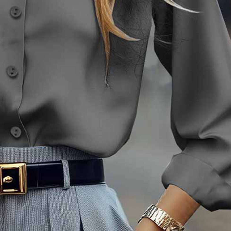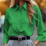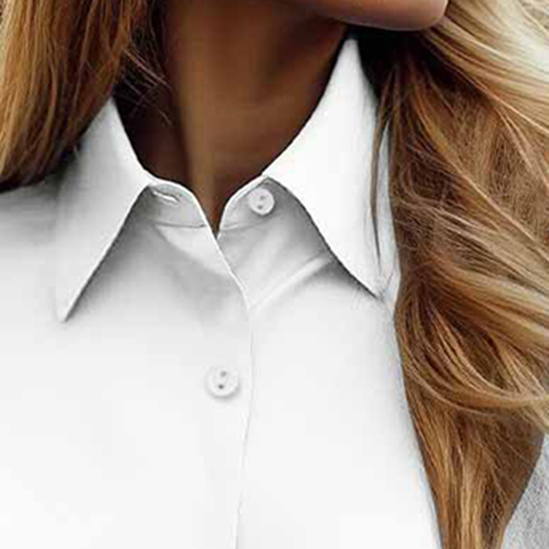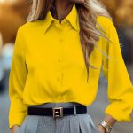 This plus size women’s blouse features a solid color design combined with a classic lapel collar and long sleeves. Crafted for a flattering fit, it is equipped with a traditional button-down front, suitable for both office environments and formal events. The fabric provides comfort while maintaining a polished appearance throughout the day. This versatile shirt delivers a professional look with easy styling options for various occasions.