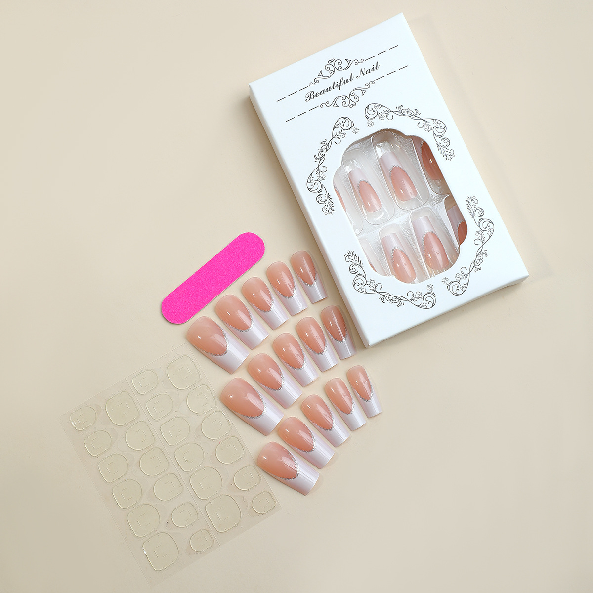 This product features ready-made rectangular nail art designed in a classic French style, offering a chic and wearable solution for nails. Crafted for easy application, the nail art provides a neat, polished look suitable for various occasions. The design ensures a comfortable fit and long-lasting wear, enhancing nail appearance without the need for extensive detailing. Ideal for those seeking an elegant and time-saving nail enhancement option.