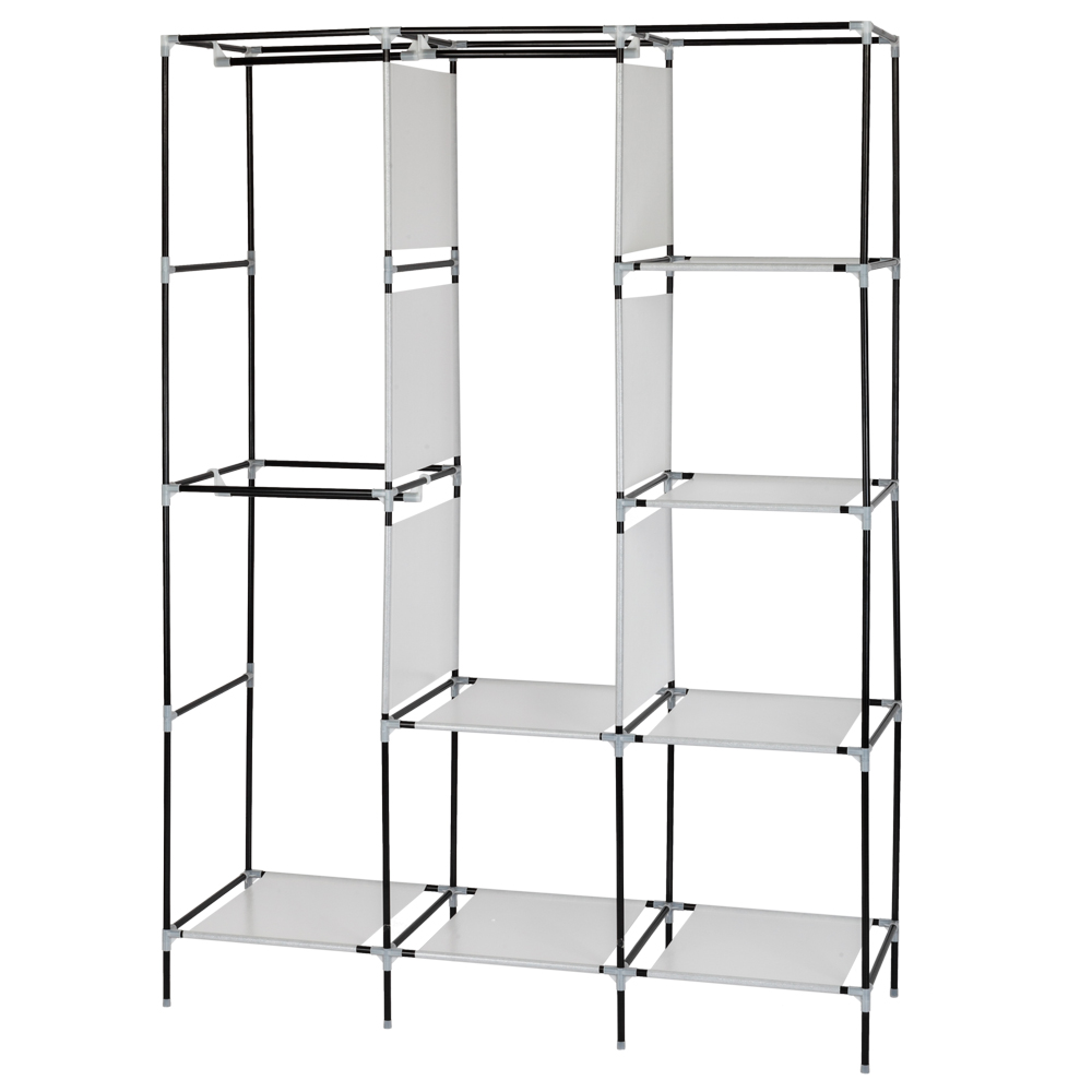 This portable closet wardrobe features a sturdy black clothes rack combined with a convenient storage shelf, designed to optimize your clothing organization. The rack provides ample space to hang garments neatly, while the integrated shelf offers additional storage for shoes, boxes, or folded items. Crafted from durable materials, this wardrobe organizer is lightweight yet robust, making it easy to move and assemble. Its compact design efficiently utilizes space, making it suitable for bedrooms, laundry rooms, or entryways, enhancing your storage capacity while maintaining a sleek appearance.