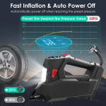 *Fast Inflation*:With a maximum pressure of 120PSI and air flow of 12L/min,it takes just few minutes to pump up a flat tire. The faster the tire inflator is,the faster you’ll be on the road.