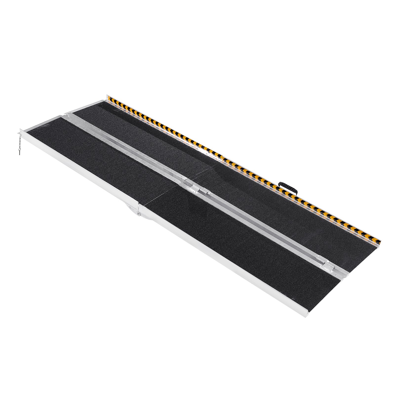 This 7-foot portable wheelchair ramp features a robust aluminum construction capable of supporting up to 800 pounds. Designed with a non-slip surface, it ensures secure traction for mobility scooters and wheelchairs. The foldable design enhances portability and convenient storage. Suitable for home use, it facilitates easy access over steps, doorways, curbs, and thresholds, improving mobility and independence for users with limited mobility.