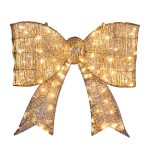 Large pre-lit golden bowknot with 124 warm white LEDs, perfect for indoor and outdoor holiday decorating at doors, gates, and walls.