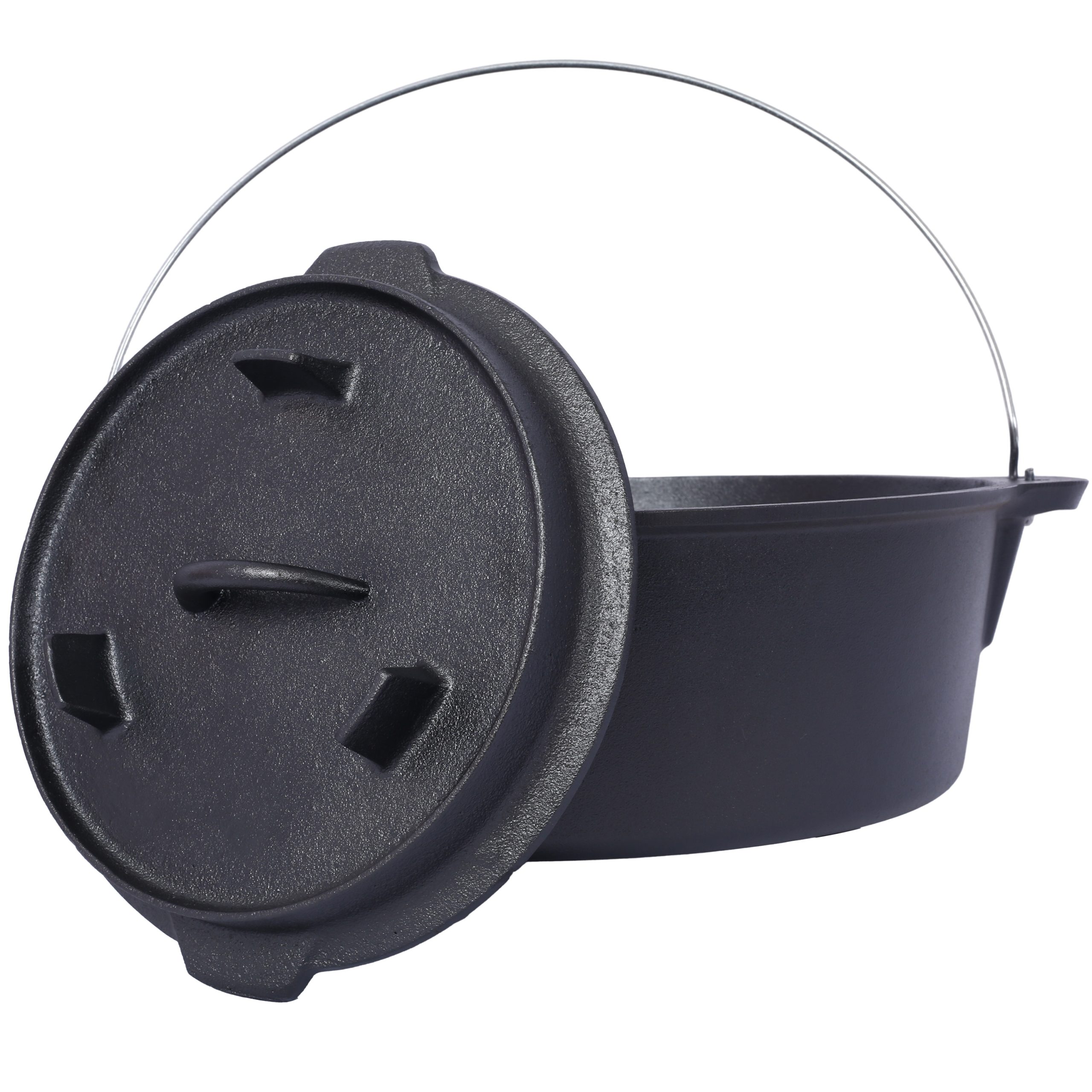 This pre-seasoned cast iron Dutch oven features a 12-quart capacity, perfect for outdoor cooking activities such as camping, fireplace cooking, BBQ, baking, and campfire use. Its deep pot design enables even heat distribution for superior cooking results. The skillet lid doubles as a versatile pan, enhancing its utility in various recipes. Included with the Dutch oven is a sturdy iron pot rack, which aids in safe and convenient placement over campfires or grills. Crafted from durable cast iron, this oven ensures long-lasting performance and excellent heat retention, making it an essential tool for any outdoor culinary experience.