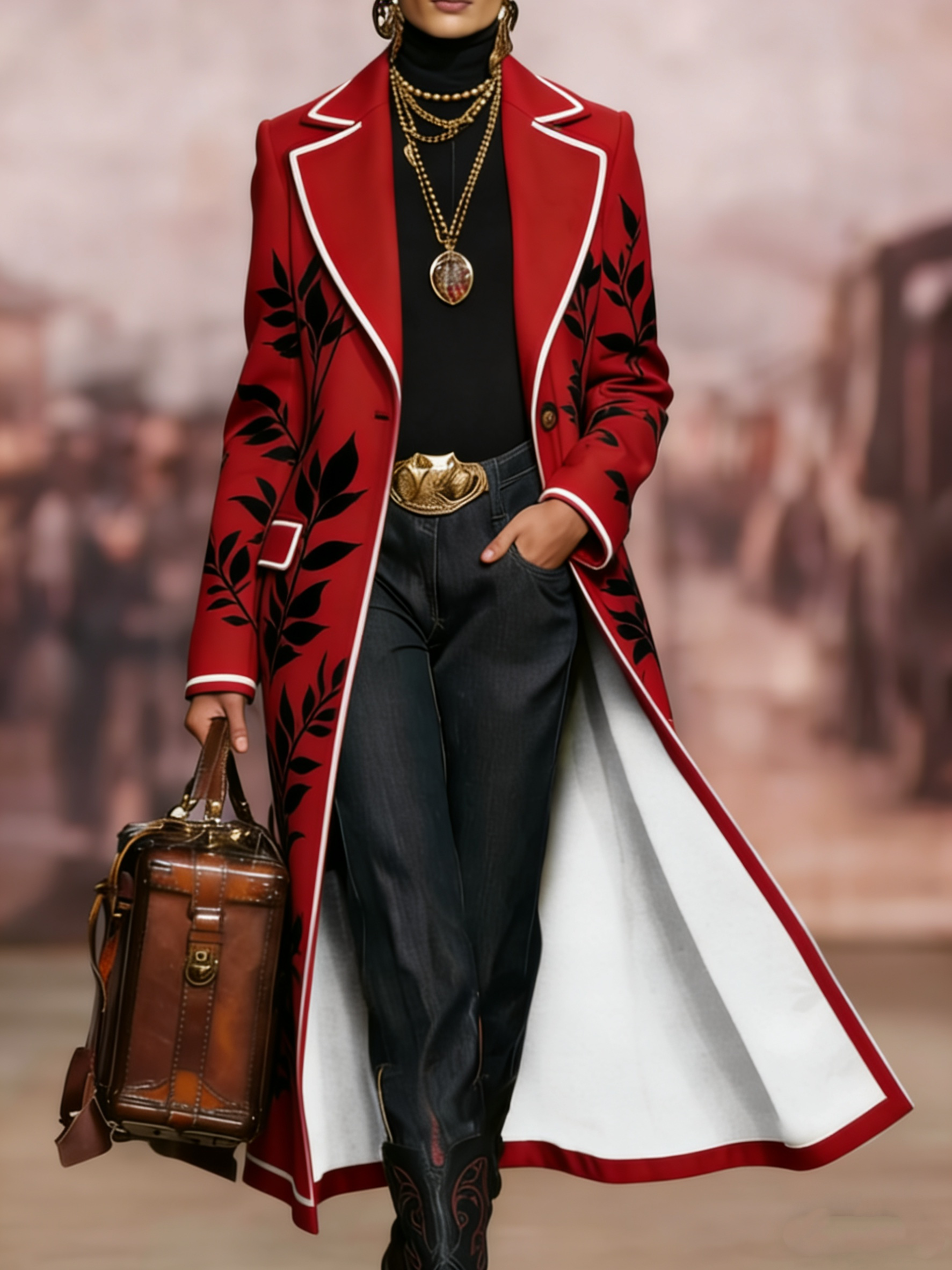Stylish printed long wool coat offering warmth and casual elegance, perfect for cold weather wear.