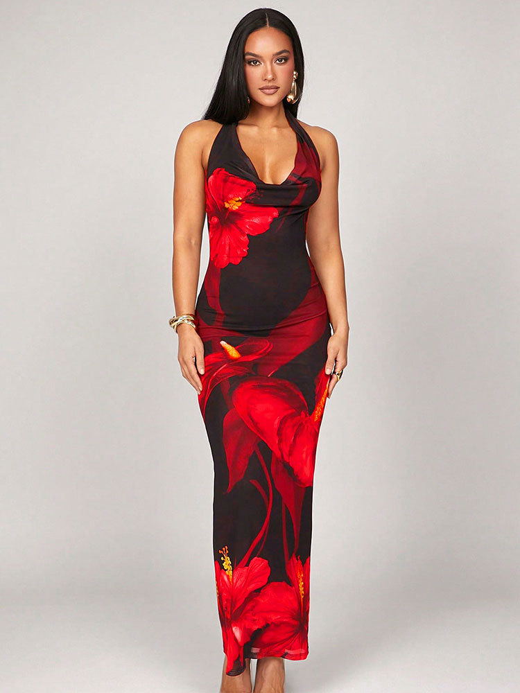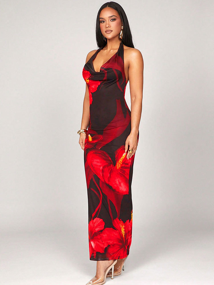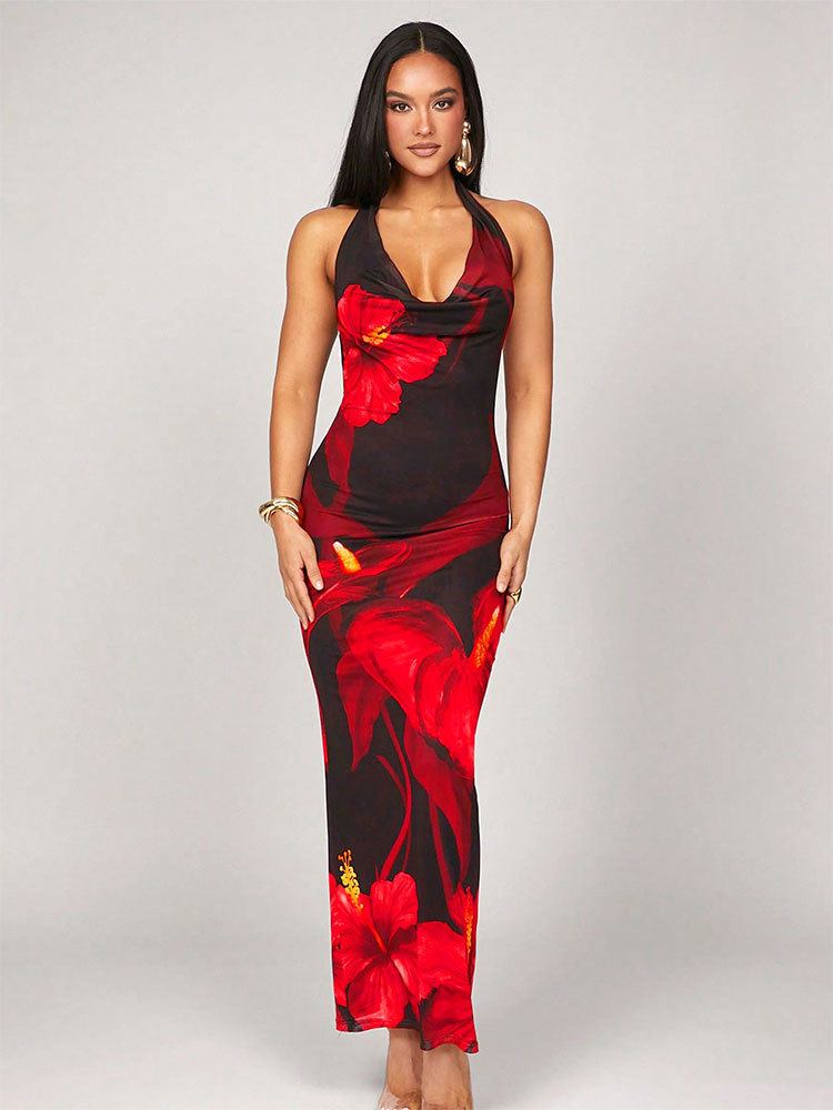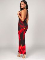 Stylish printed halterneck bodycon dress featuring lace-up details for a fashionable and sexy look.