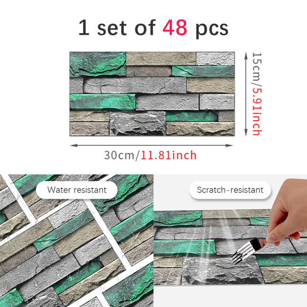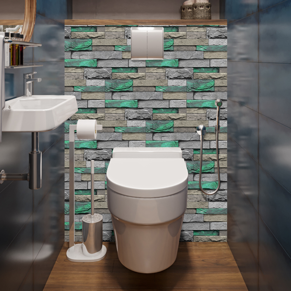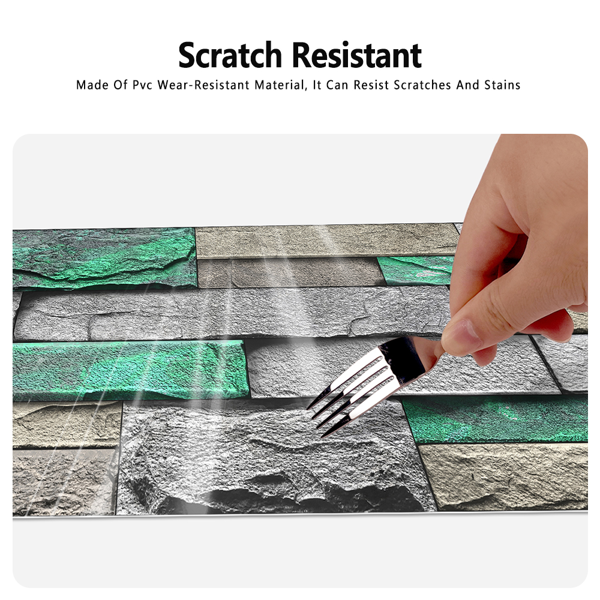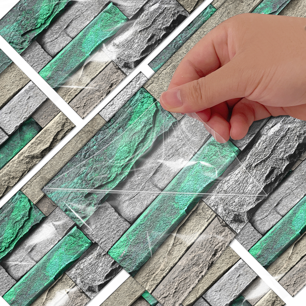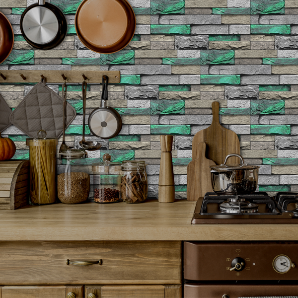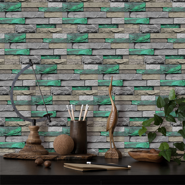 This PVC self-adhesive wallpaper features a green brick and stone pattern, providing a stylish and textured look for interior walls. Designed for easy application, it adheres firmly yet can be removed without leaving any glue residue. The peel-and-stick backing ensures quick installation and repositioning, making it ideal for home or office decorating. Durable and water-resistant, this wallpaper offers both aesthetic appeal and practical functionality, suitable for various surfaces. Refresh your space effortlessly with this removable wall covering.