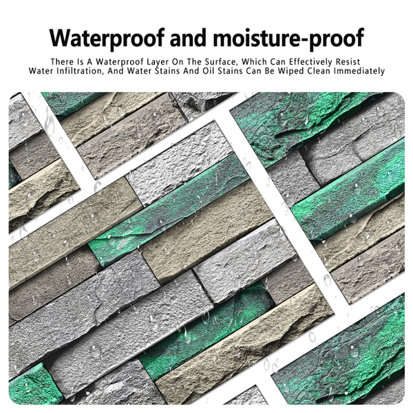 Durable PVC peel-and-stick wallpaper with green brick and stone design, easily removable without glue residue for effortless home decor updates.