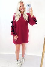 Stylish racing red sweater featuring contrast stripes, bow detailing, and comfortable drop shoulder design.