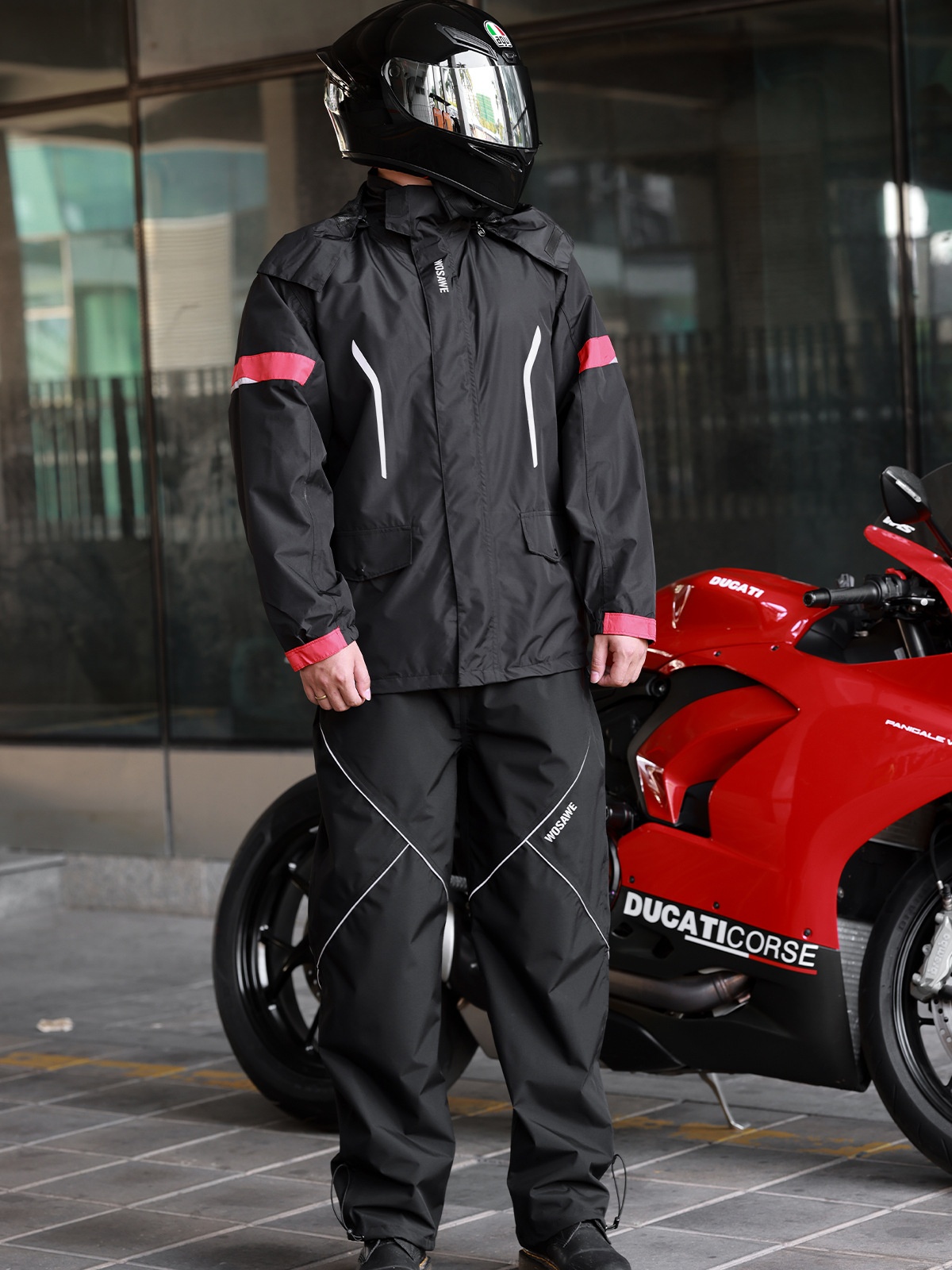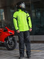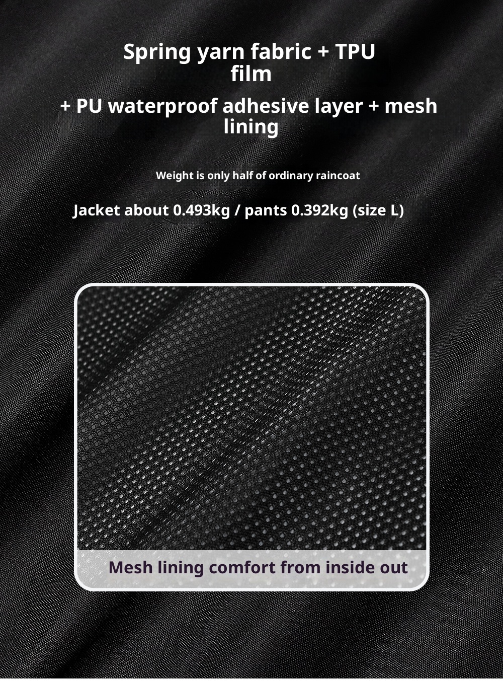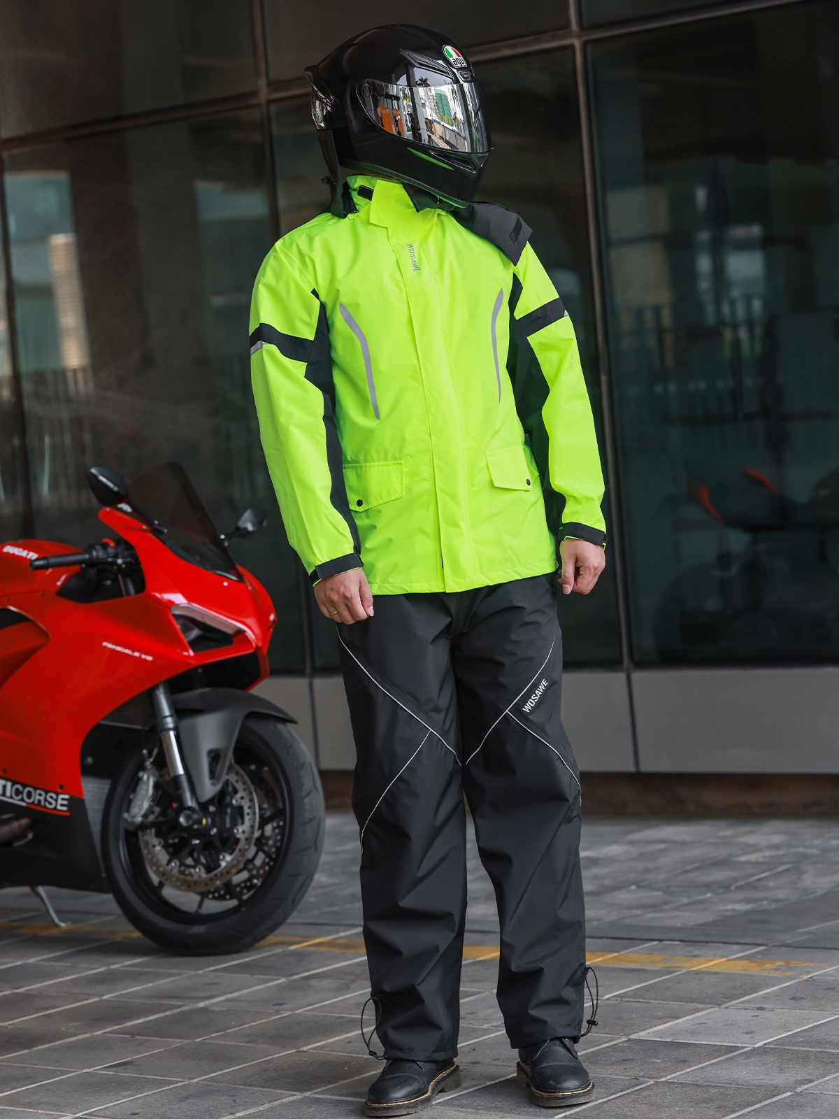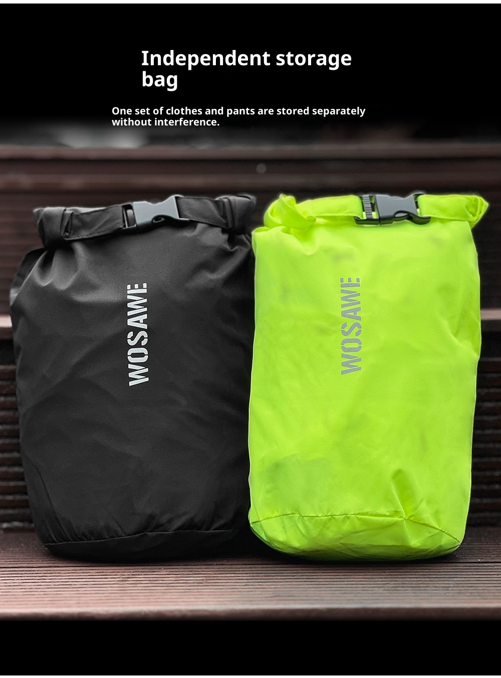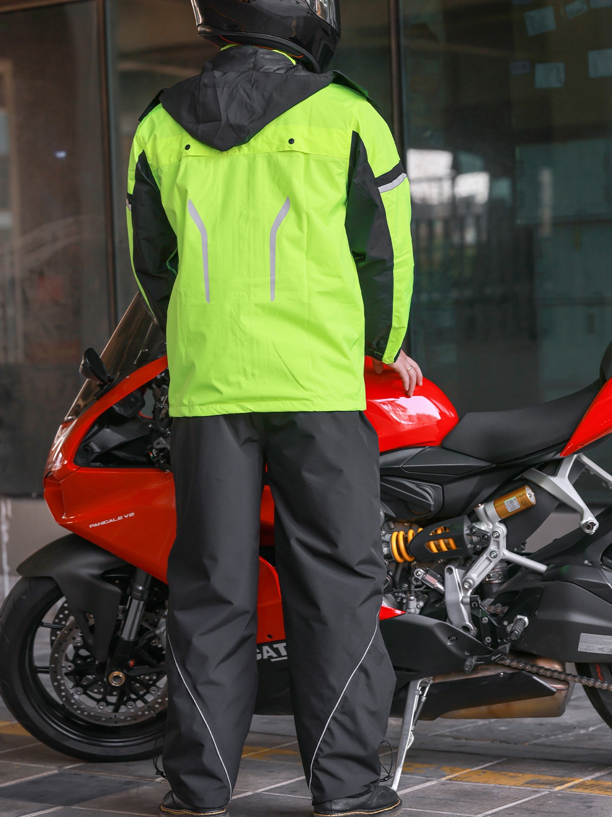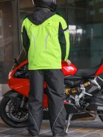 Durable rainproof raincoat suit with jacket, trousers and buggy bag ideal for motorcycle riding, fishing, hiking, and camping in wet conditions.