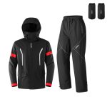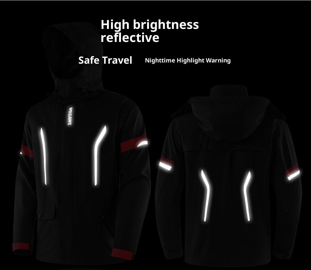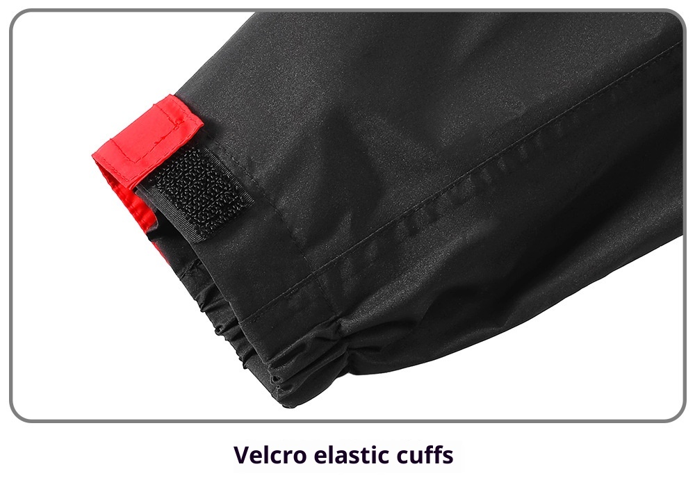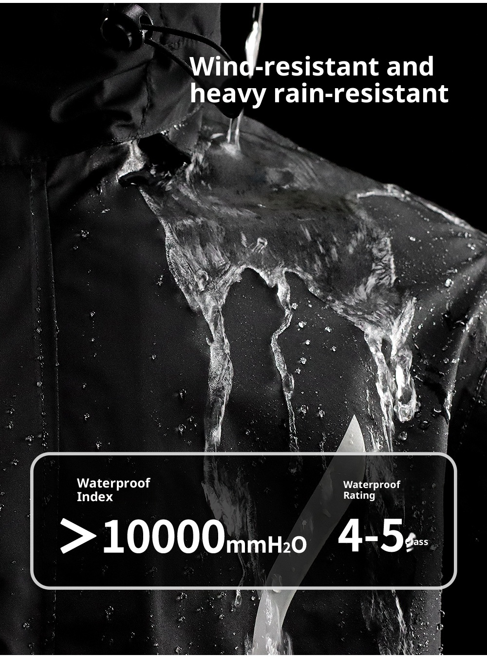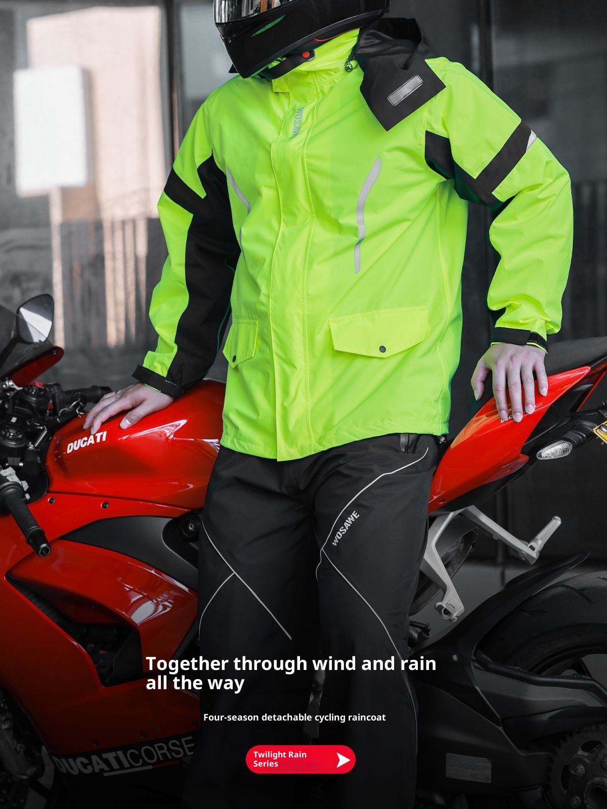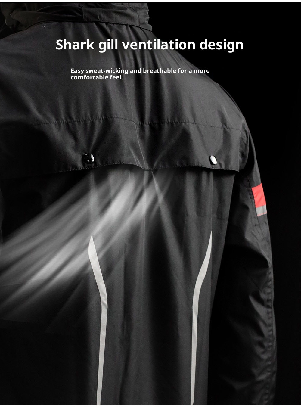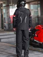 Durable rainproof raincoat suit with jacket, trousers and buggy bag ideal for motorcycle riding, fishing, hiking, and camping in wet conditions.