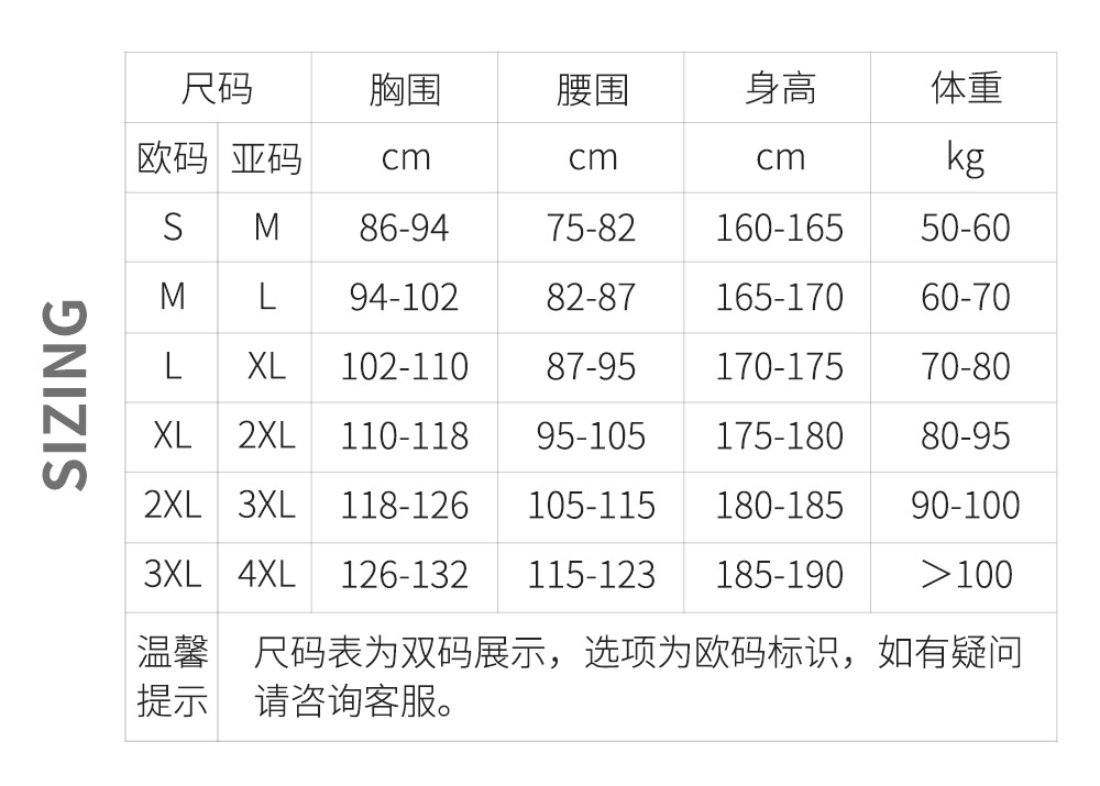 Size: Asian code M/European code S, Asian Code L/European code M, Asian code XL/European code L, Asian code 2XL/European code XL, asian code 3XL/European code 2XL, Asian code 4XL/European code 3XL