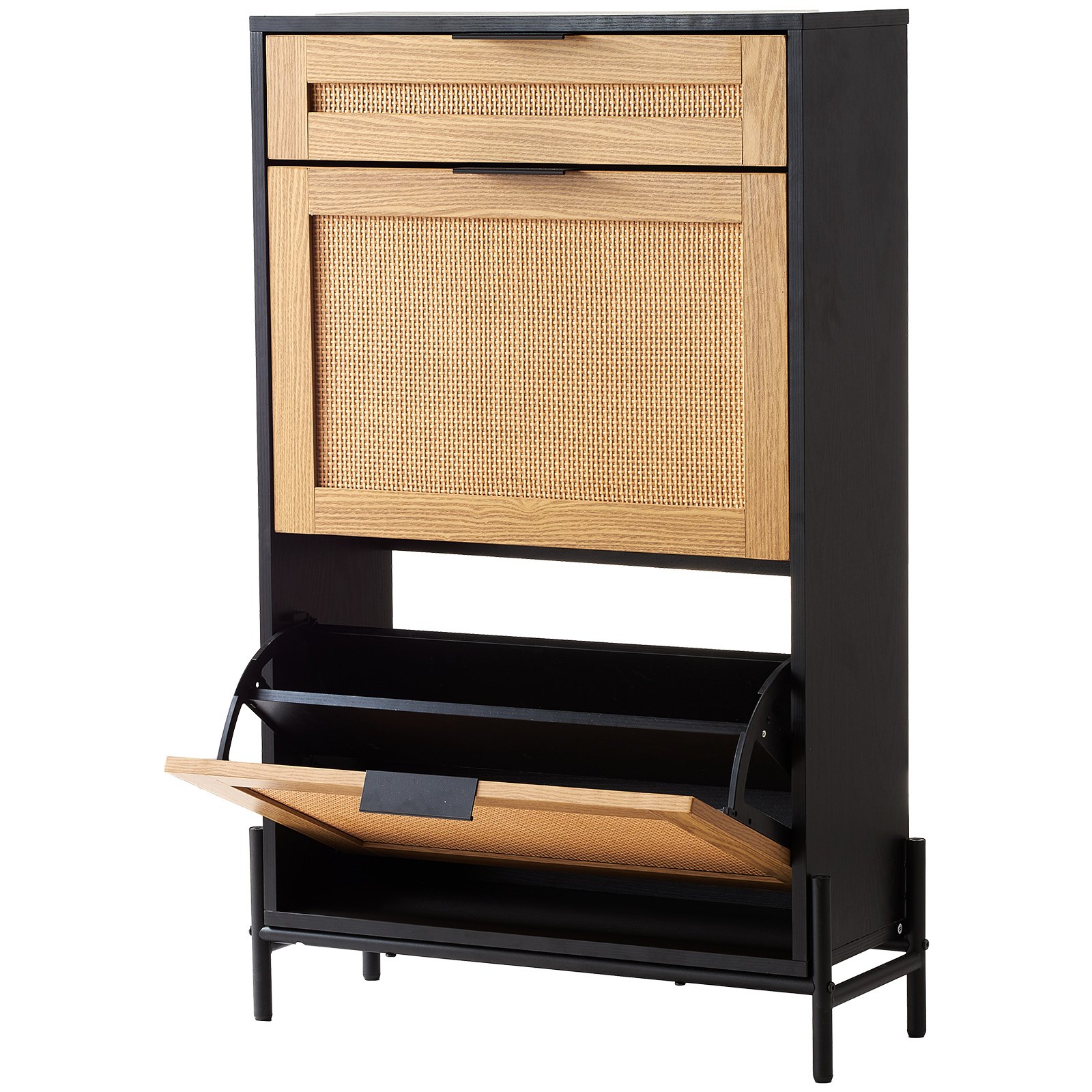 Narrow black rattan shoe cabinet with metal legs featuring 2 flip and 1 slide drawer, perfect for organizing shoes in entryways and hallways.
