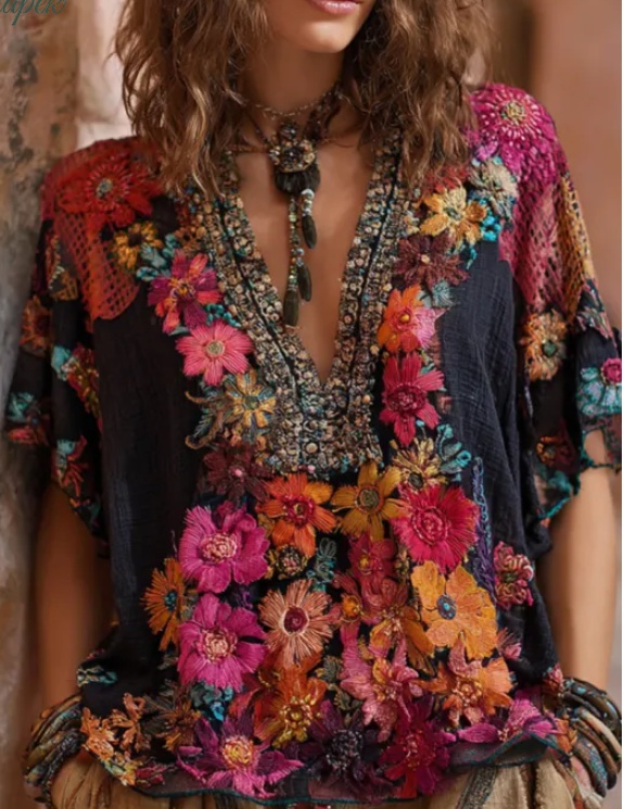 This retro-inspired casual top showcases a distinctive color-blocked design, featuring a flattering V-neckline and mid-length sleeves. Crafted from soft, breathable fabric, it ensures comfort and ease of wear throughout the day. The relaxed fit makes it suitable for various casual occasions, offering both style and versatility. Ideal for pairing with jeans or skirts, this top combines vintage charm with modern comfort.