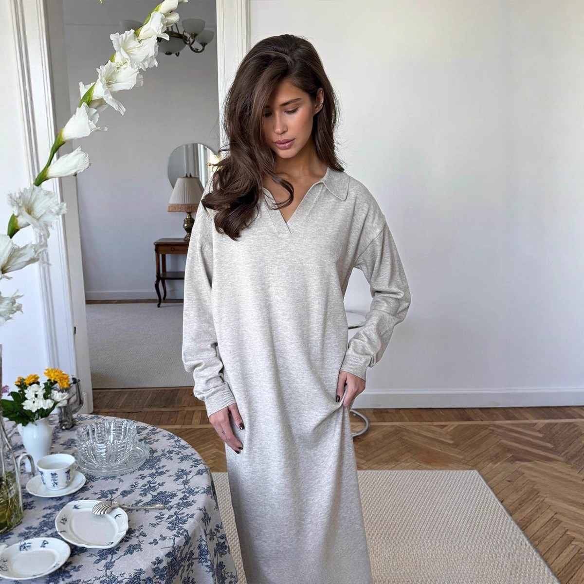 This retro lazy style women’s dress features a distinctive scissors collar design that adds a subtle, fashionable edge. Crafted from knitted fabric, it ensures comfort and warmth, suitable for cooler seasons. The long sleeves and relaxed fit provide ease of movement, making it ideal for casual wear while maintaining a chic appearance. Its vintage-inspired aesthetic merges effortlessly with everyday style, delivering both elegance and comfort.