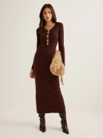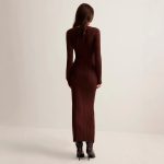 Classic retro-inspired slim-fit knitwear dress with V-neck and long sleeves, designed for a stylish silhouette and comfortable fit.
